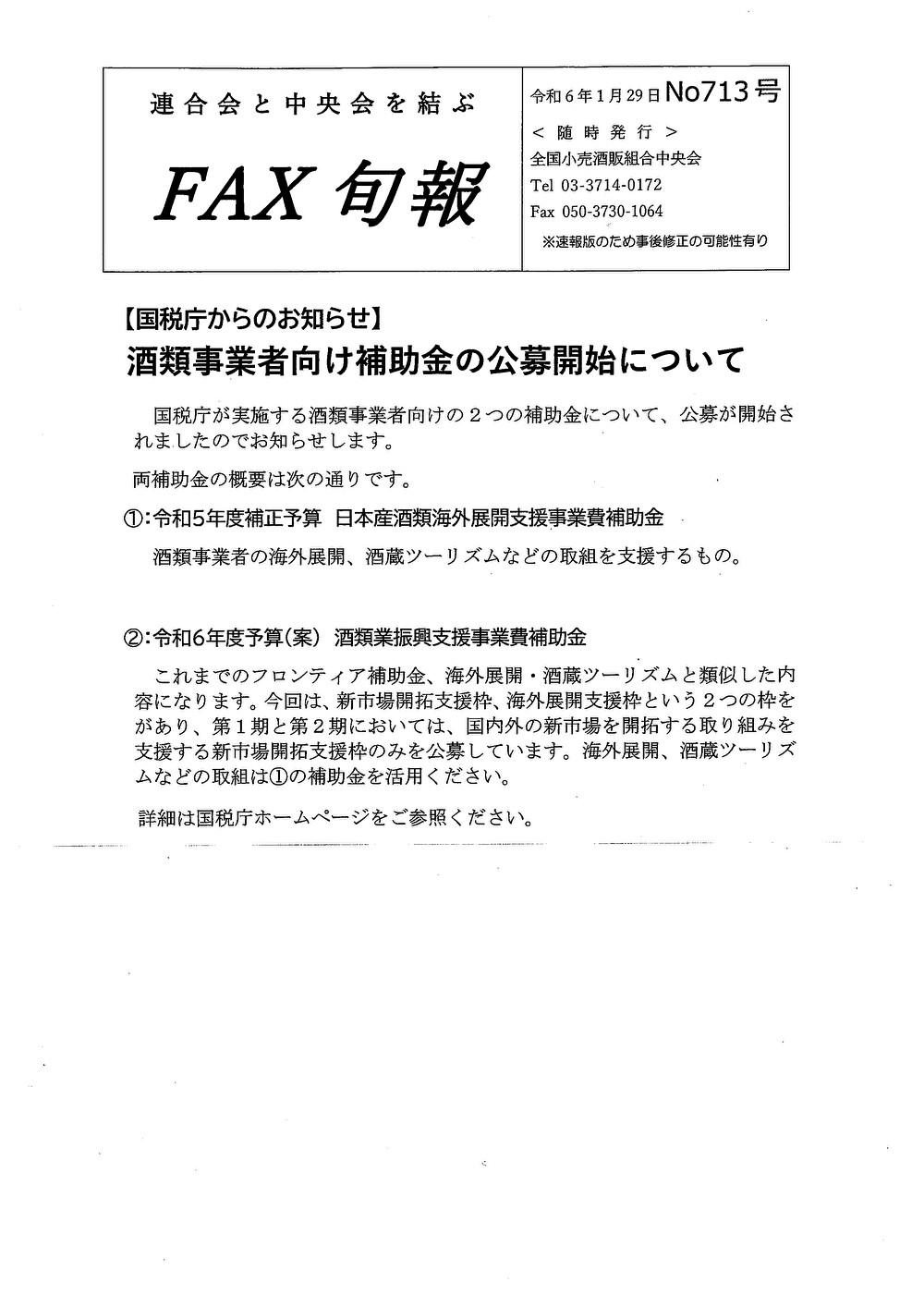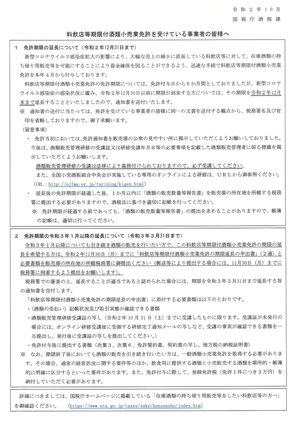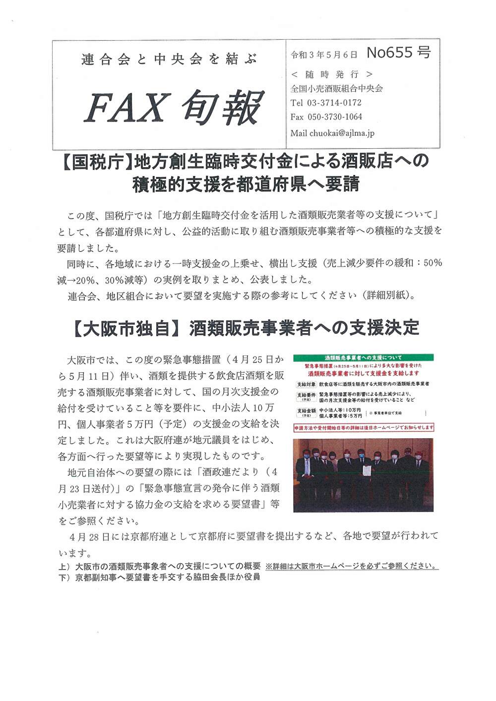 ★FAX旬報No655号 【国税庁】地方創生臨時交付金による酒販店への積極的支援を都道府県へ要請 R3.5.6