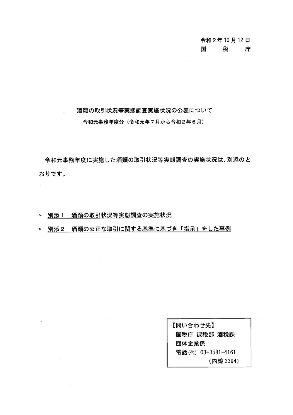令和2年10月12日、令和元事務年度(令和元年7月~令和2年6月)における酒類の取引状況等実態調査の実施状況が公表されました。