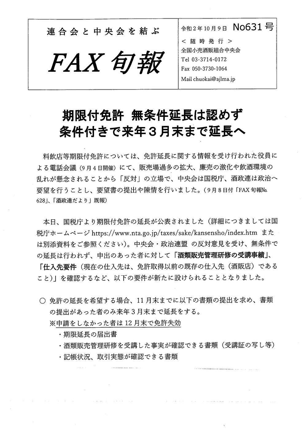 ★FAX旬報No631号 期限付免許 無条件延長は認めず 条件付きで来年3月まで延長 2020年10月9日