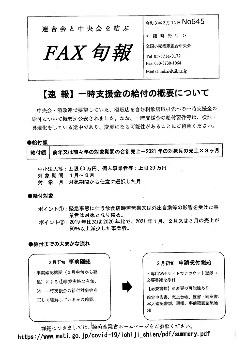 ★FAX旬報No645 【速報】一時支援金の給付の概要について 2021年2月12日