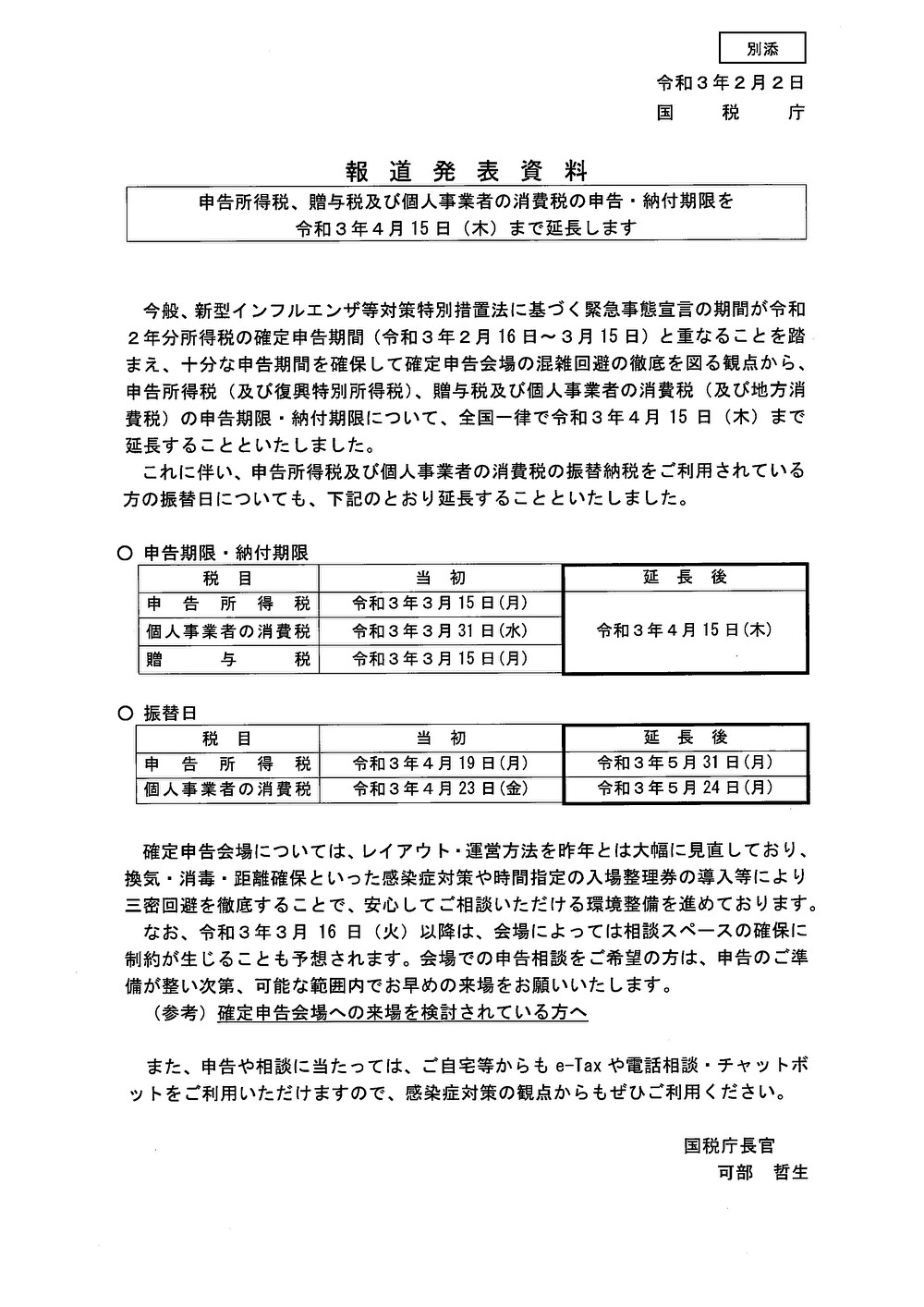 緊急事態宣言の期間が令和2年分所得税の確定申告期間(令和3年2月16日~3月15日)と重なることを踏まえ、十分な申告期間を確保して確定申告会場の混雑回避の徹底を図る観点から、申告所得税(及び復興特別所得税、贈与税及び個人事業者の消費税(及び地方消費税)の申告期間・納付期限について、全国一律で令和3年4月15日(木)まで延長されます。