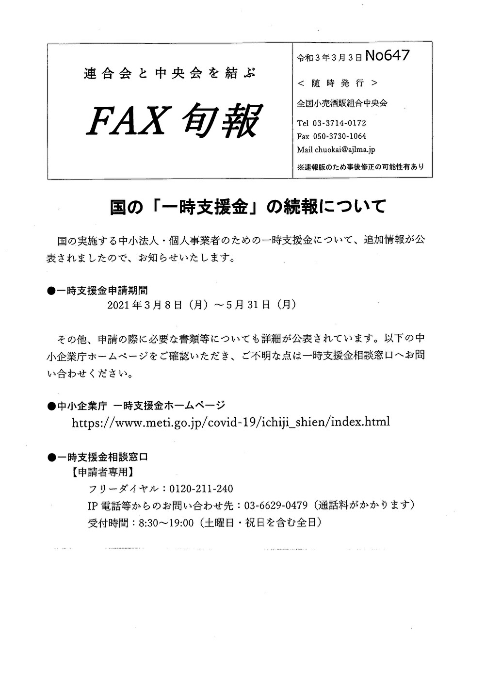 ★FAX旬報No647号 国の「一時支援金」の続報について 2021年3月3日