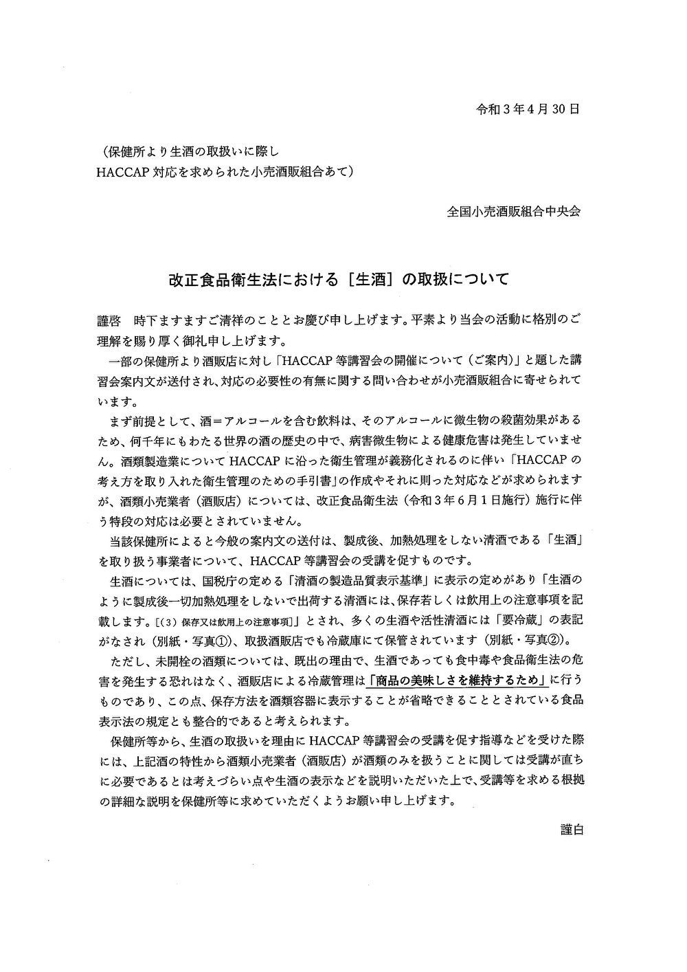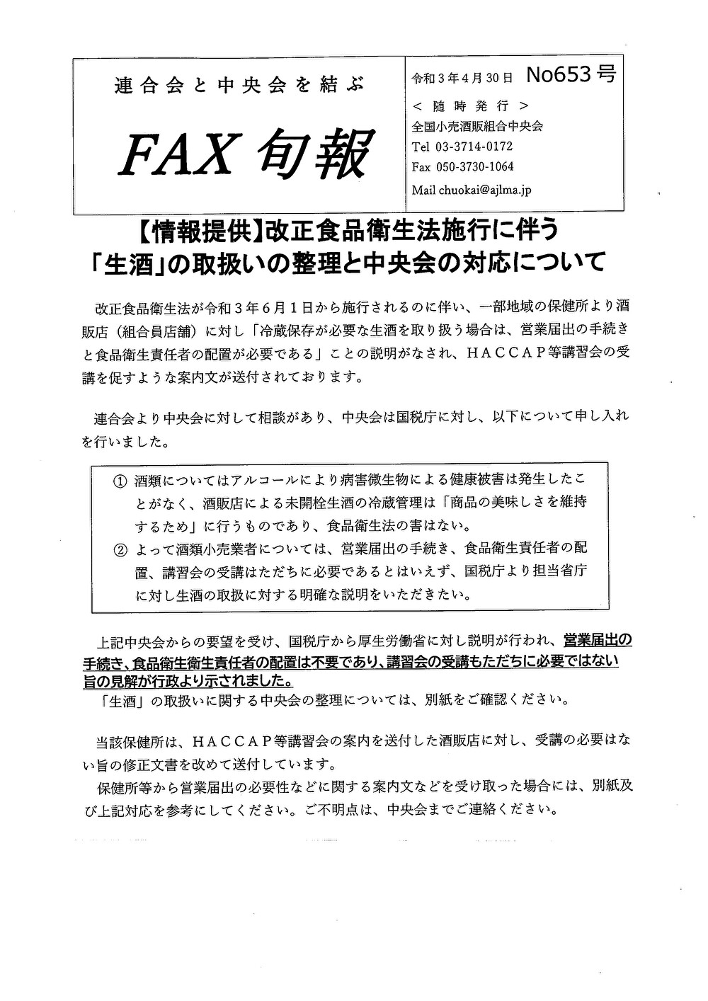★FAX旬報No653号 改正食品衛生法施行に伴う「生酒」の取扱いの整理と中央会の対応について R3.4.30