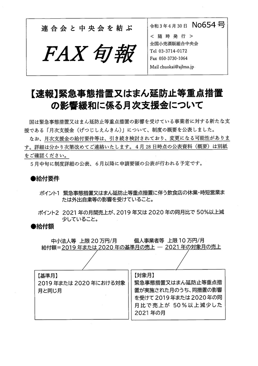 ★FAX旬報No654号 【速報】緊急事態措置又はまん延防止等重点措置の影響緩和に係る月次支援金について R3.4.30