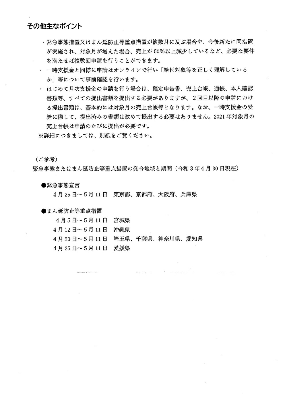 月次支援金の概要は、令和3年4月30日配信「FAX旬報No654」並びに月次支援金ホームページをご参照下さい。