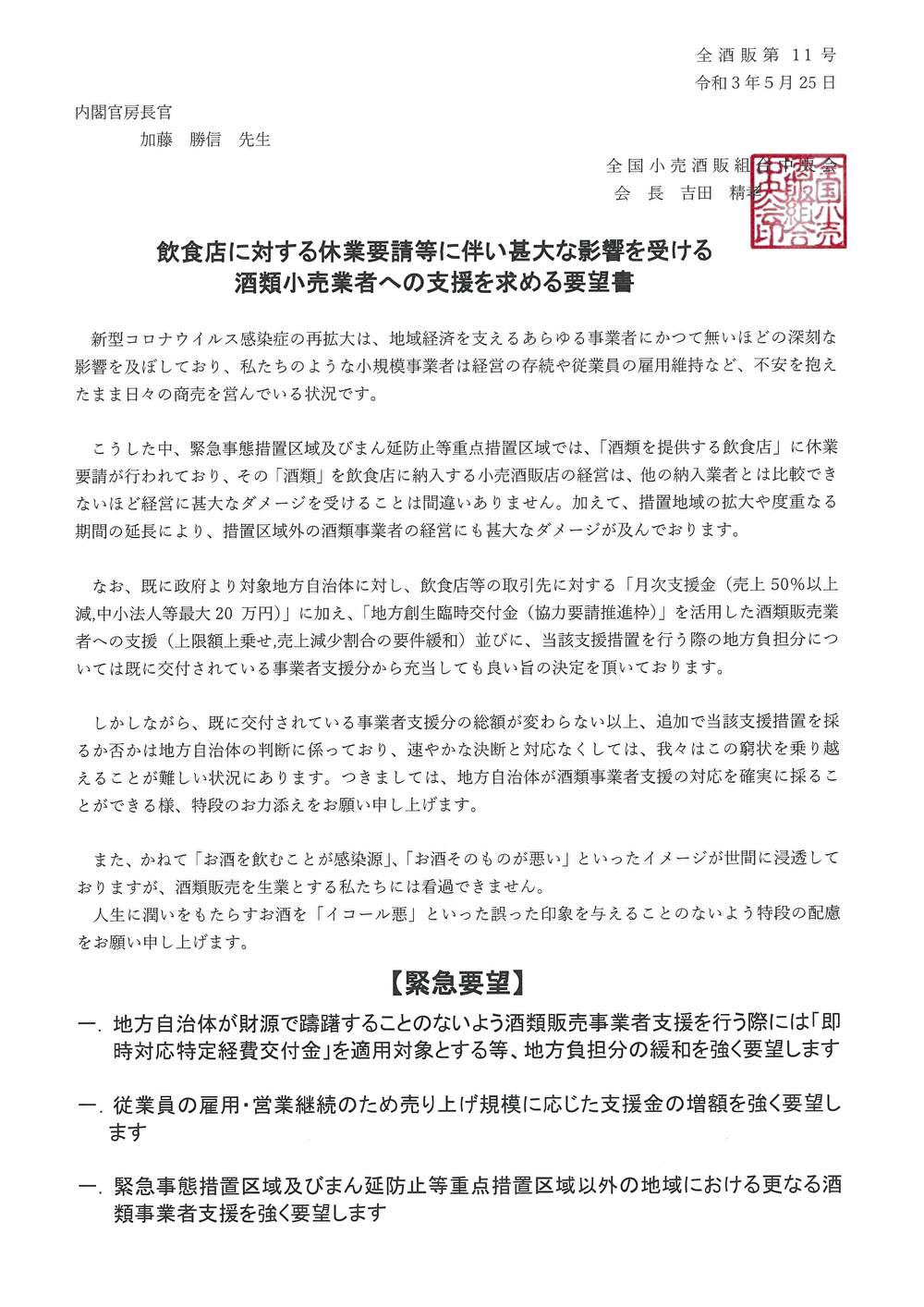 緊急事態宣言の影響の緩和を目的に国が実施する「中小企業・個人事業者のための一時支援金」に加え、都道府県・市区町村独自の支援金の給付を求める要望を、全国の連合会・小売酒販組合が行っています。