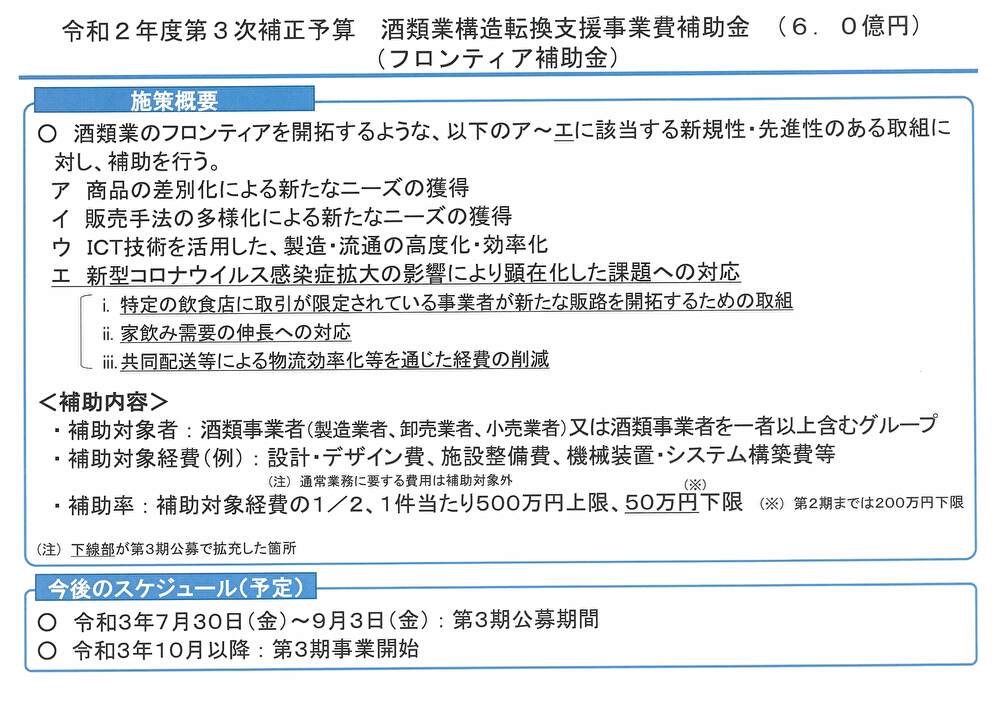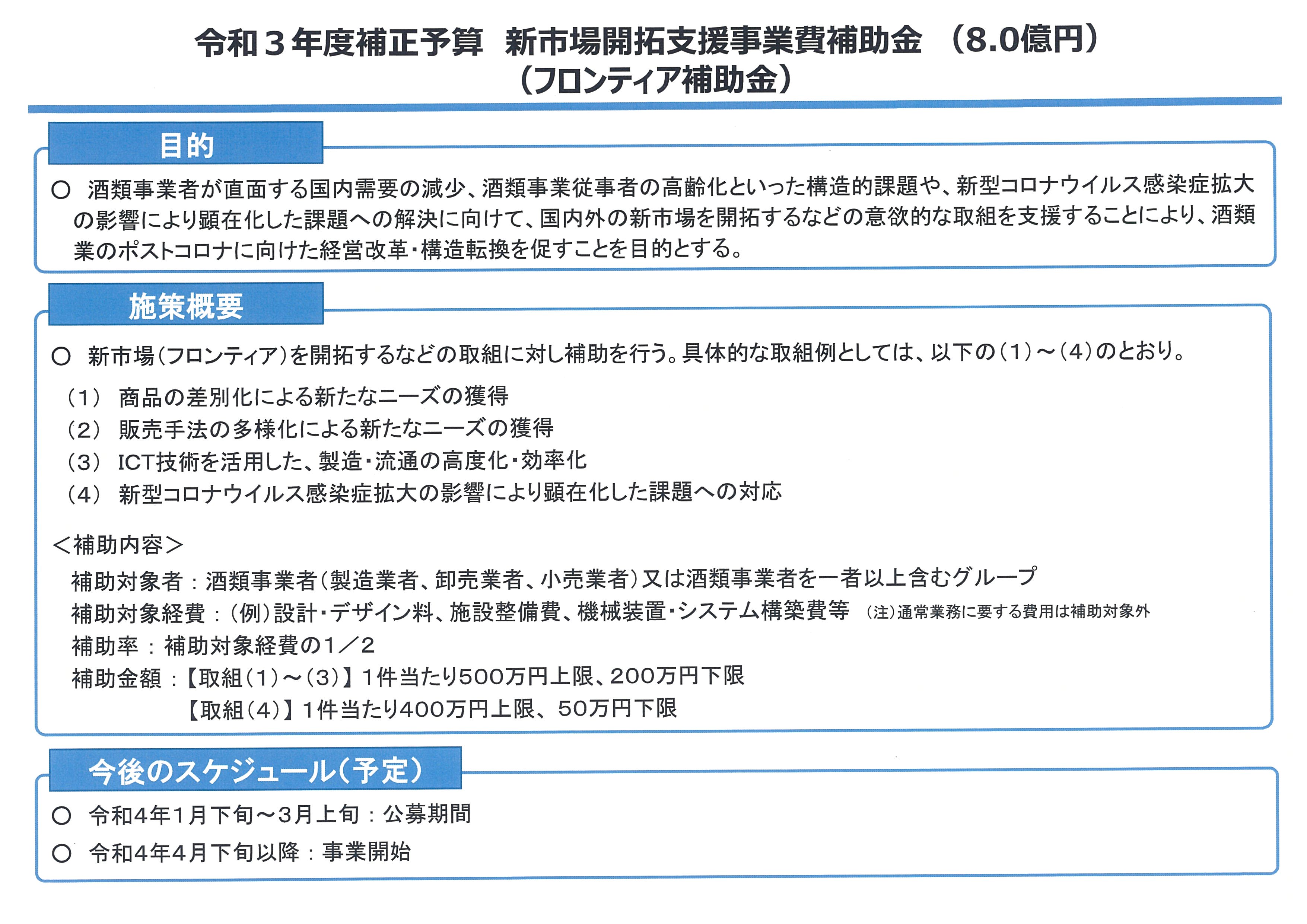 国内需要の減少や酒類事業の減少・高齢化等の構造的課題に対応するため、酒類事業者の経営改革や酒類業の構造転換を促進する取り組みを支援する「フロンティア補助金」が新たに実施されることになりました。詳細につきましては、FAX旬報 No642号をクリックしてご確認下さい。