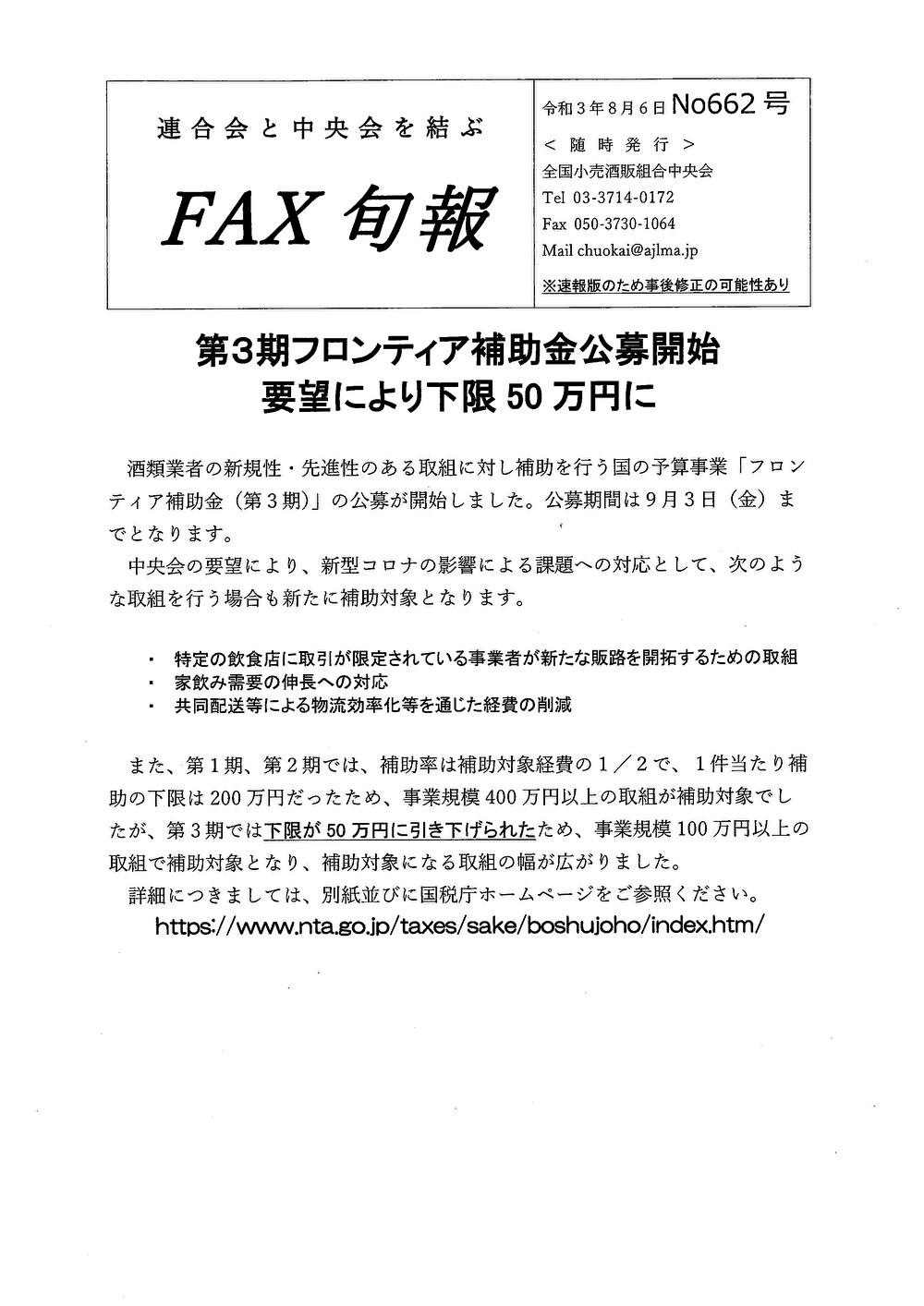 ★FAX旬報No662号 第3期フロンティア補助金公募開始 要望により下限50万円に R3.8.6
