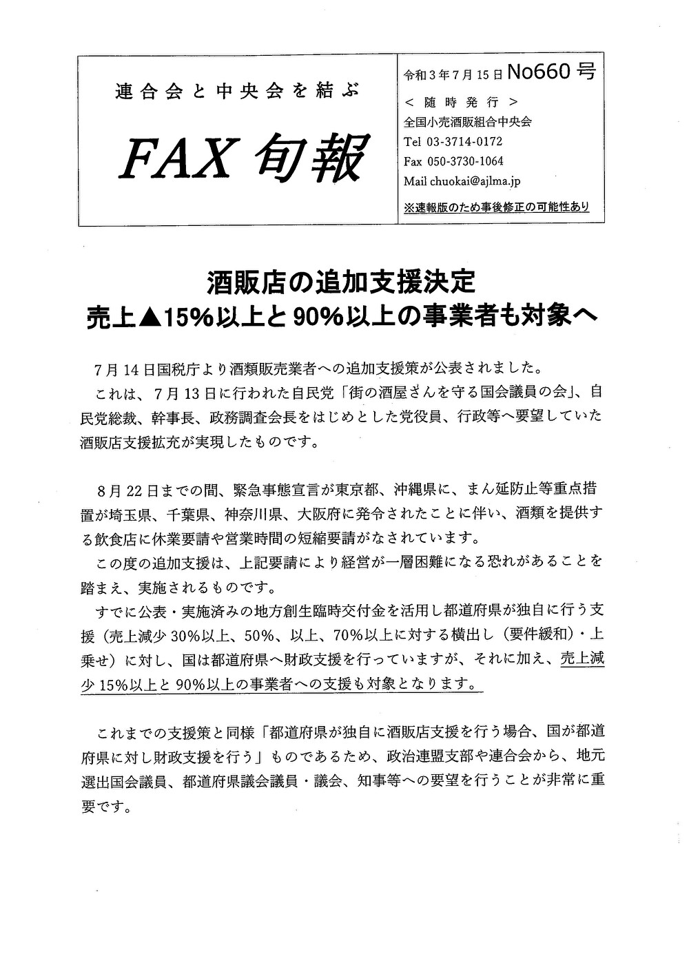 ★FAX旬報No660号 酒販店の追加支援決定 売上▲15%以上と90%以上の事業者も対象へ R3.7.15