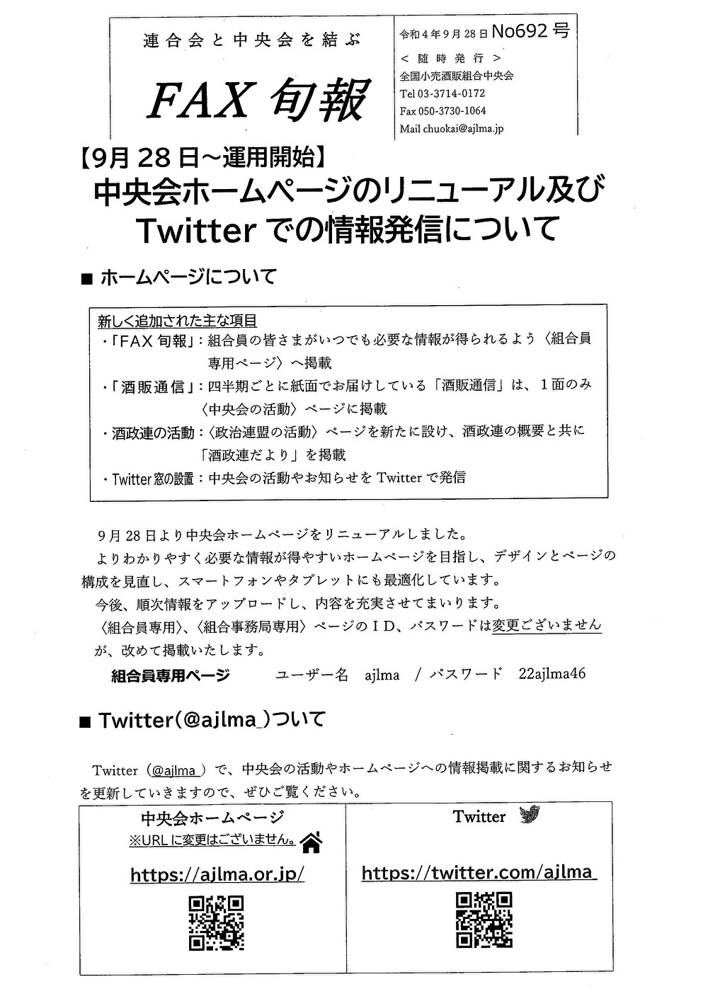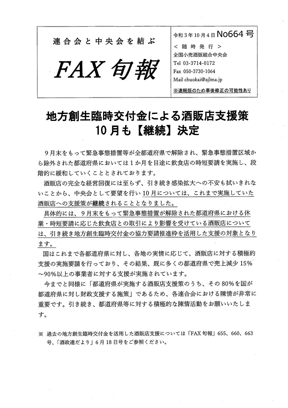 FAX旬報No664号 地方創生臨時交付金による酒販店支援策 10月も【継続】決定R3.10.4