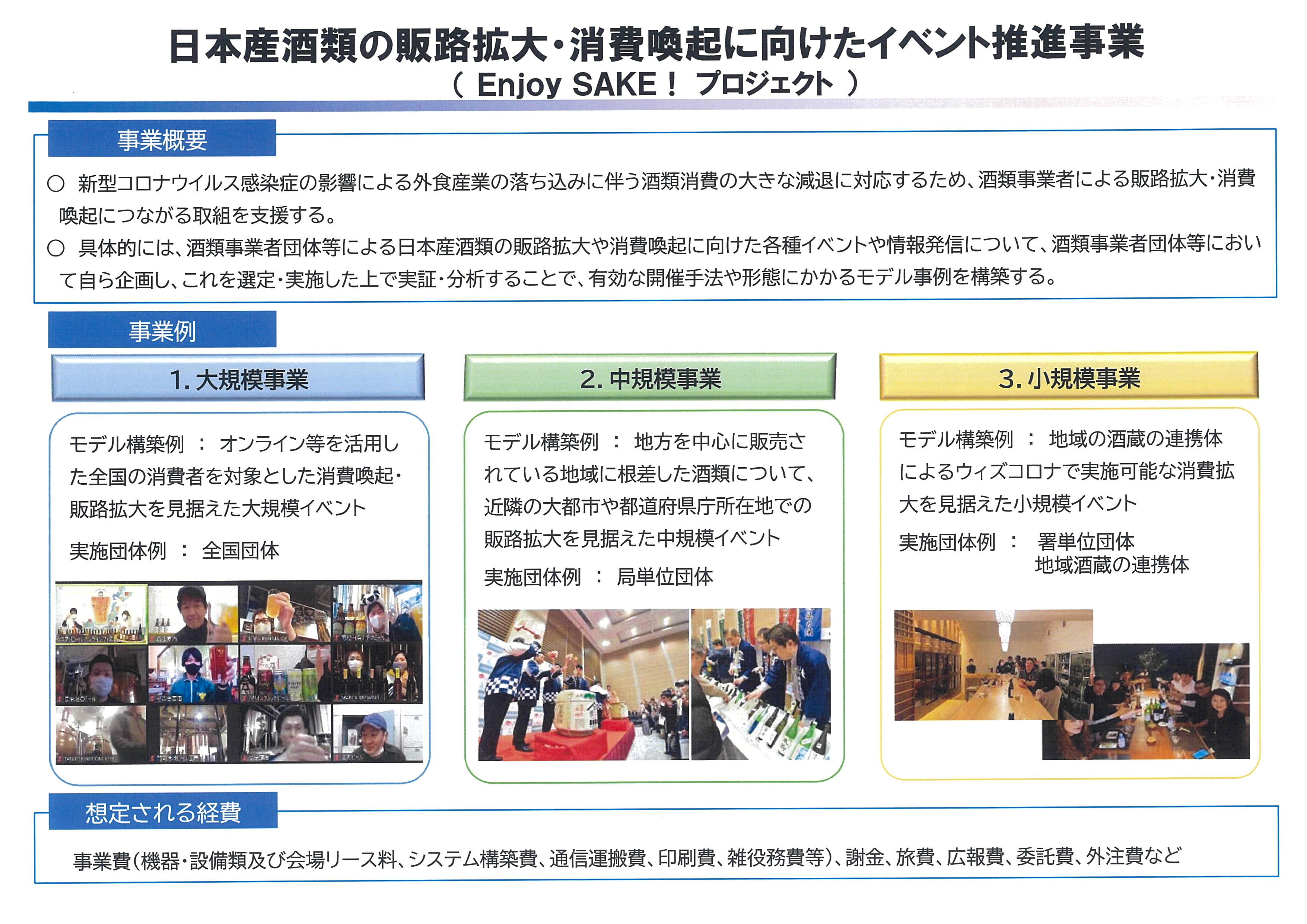 酒類事業者が直面する国内需要の減少、酒類事業従事者の高齢化といった構造的課題や、新型コロナウイルス感染症拡大の影響により顕在化した課題への解決に向けて、国内外の新市場を開拓するなどの意欲的な取組を支援。