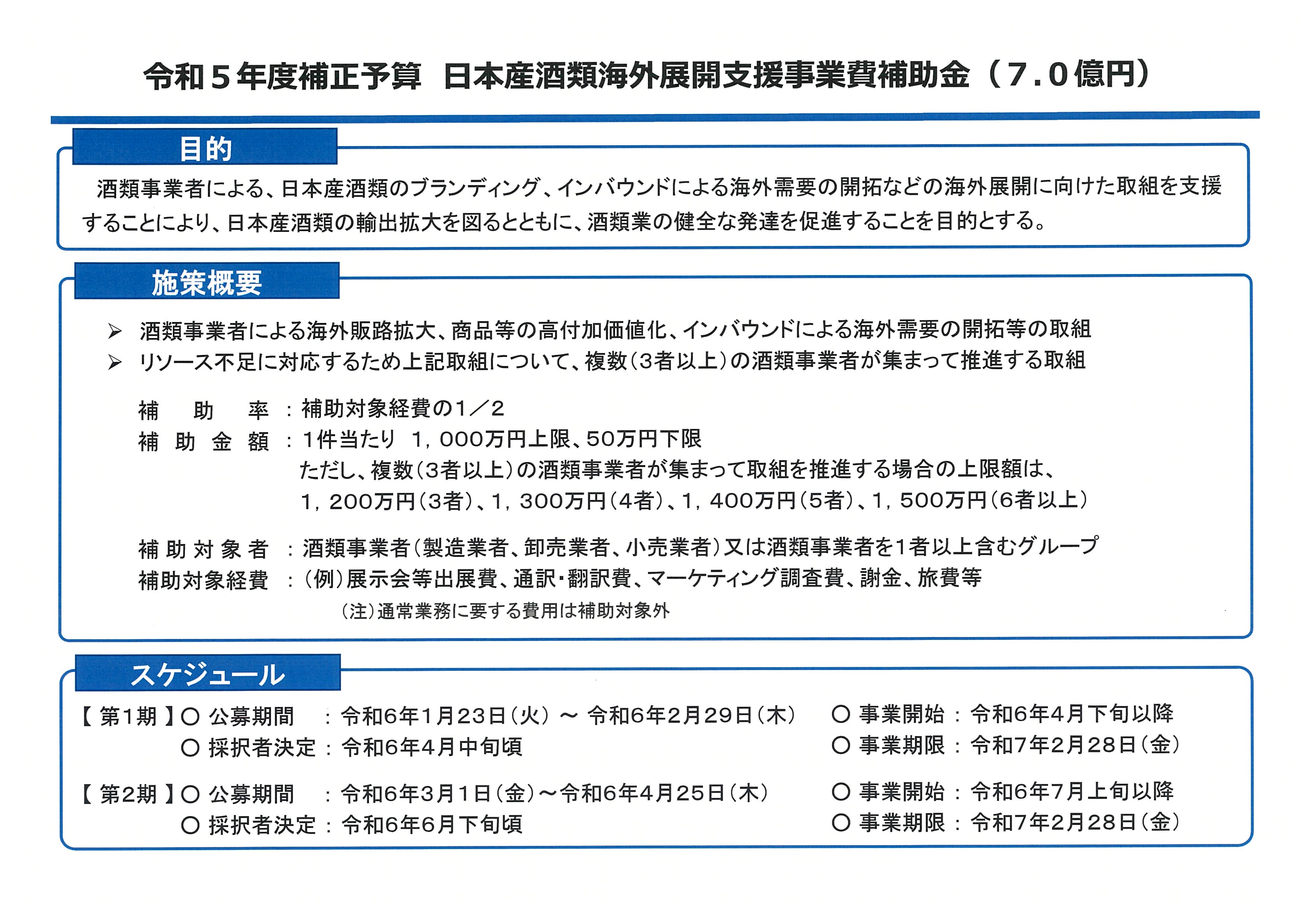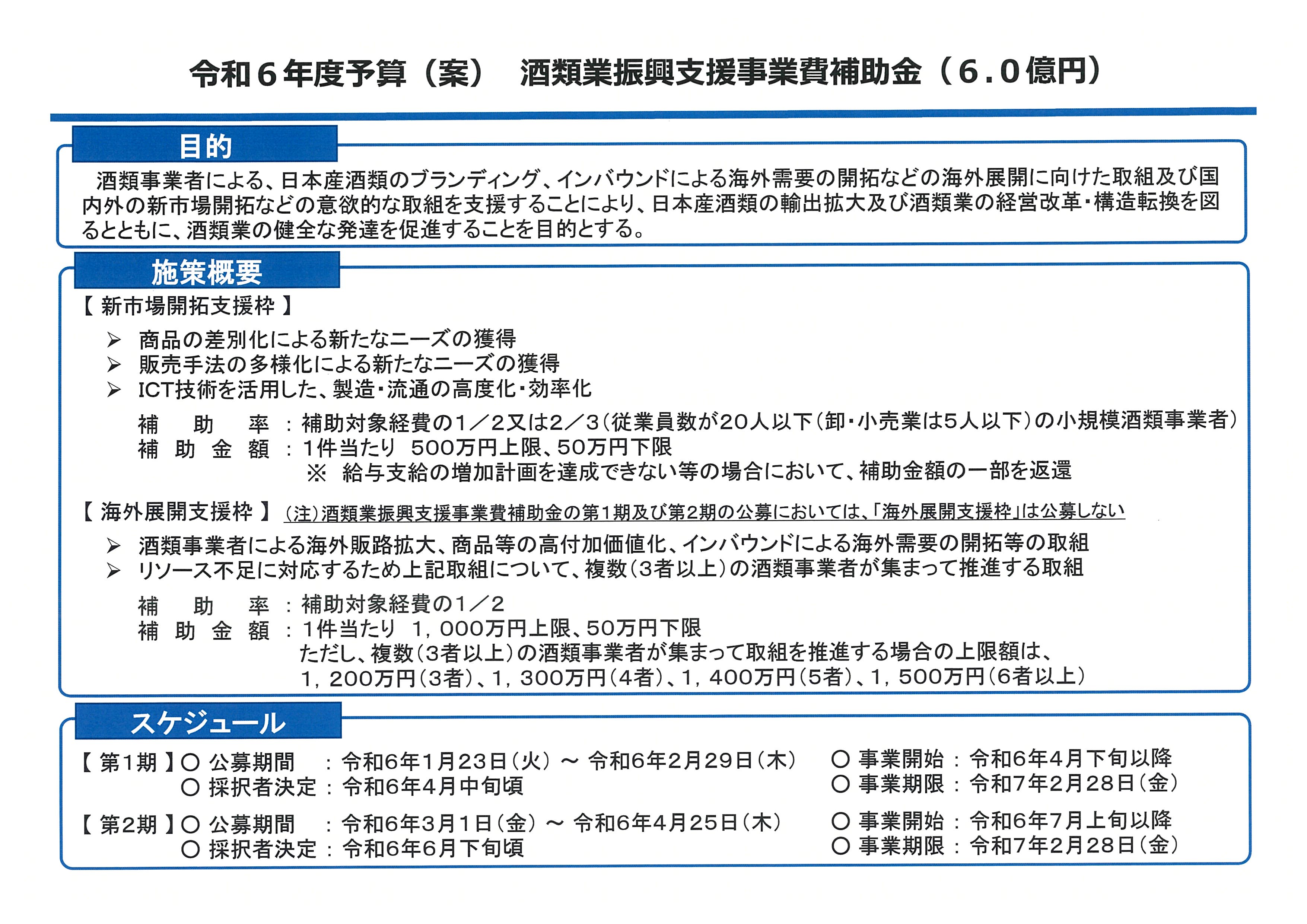 酒類業者が直面する国内需要の減少への対応を目的として、国税庁が実施する酒類事業者のための補助事業が下記の通り実施されています。