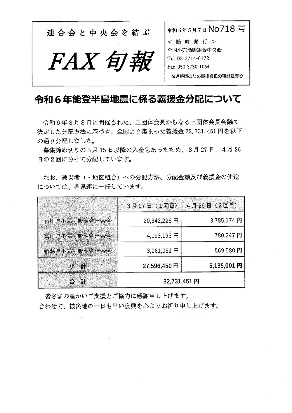 ◆FAX旬報No718号 R6.5.7令和6年能登半島地震に係る義援金分配について