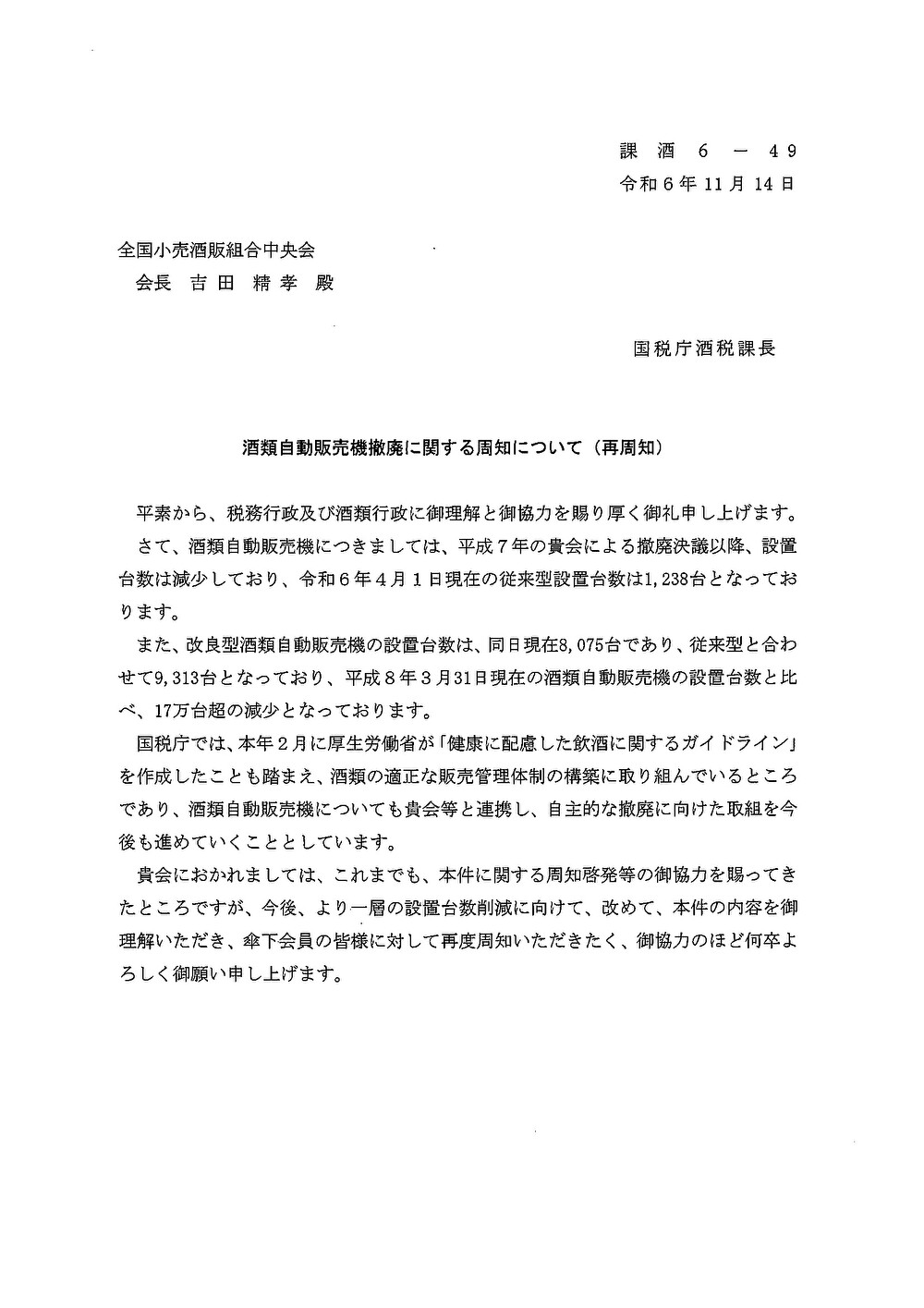 国税庁より「酒類自動販売機撤廃に関する周知について(再周知)」の連絡がございました。従来型自動販売機については、平成7年の中央会総会での撤廃決議以降も、毎年、完全撤廃に向けて取り組むことを決議しております。設置台数は大幅に減少していますが、より一層の設置台数削減に向け、ご協力をお願い致します。