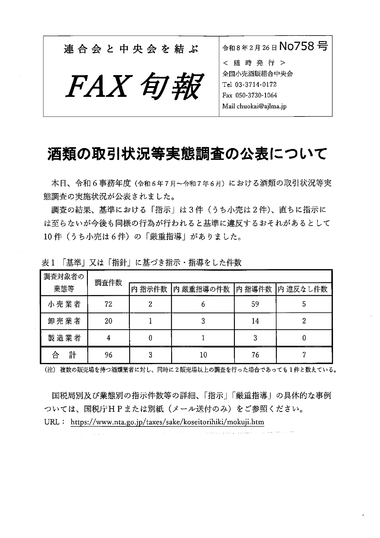 ★FAX旬報No632号 酒類の取引状況等実態調査の公表について及び「指示」事例の公表について 2020年10月13日