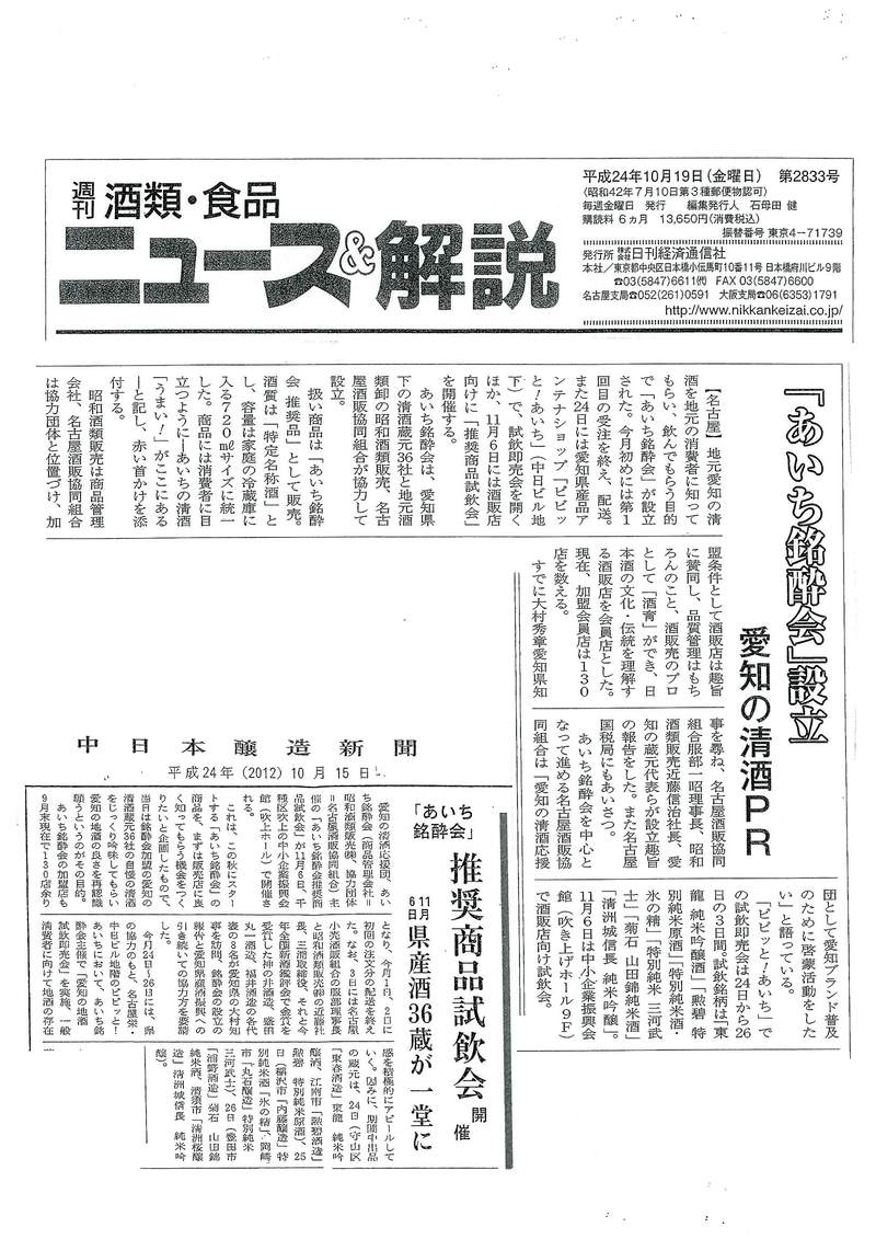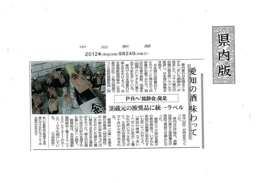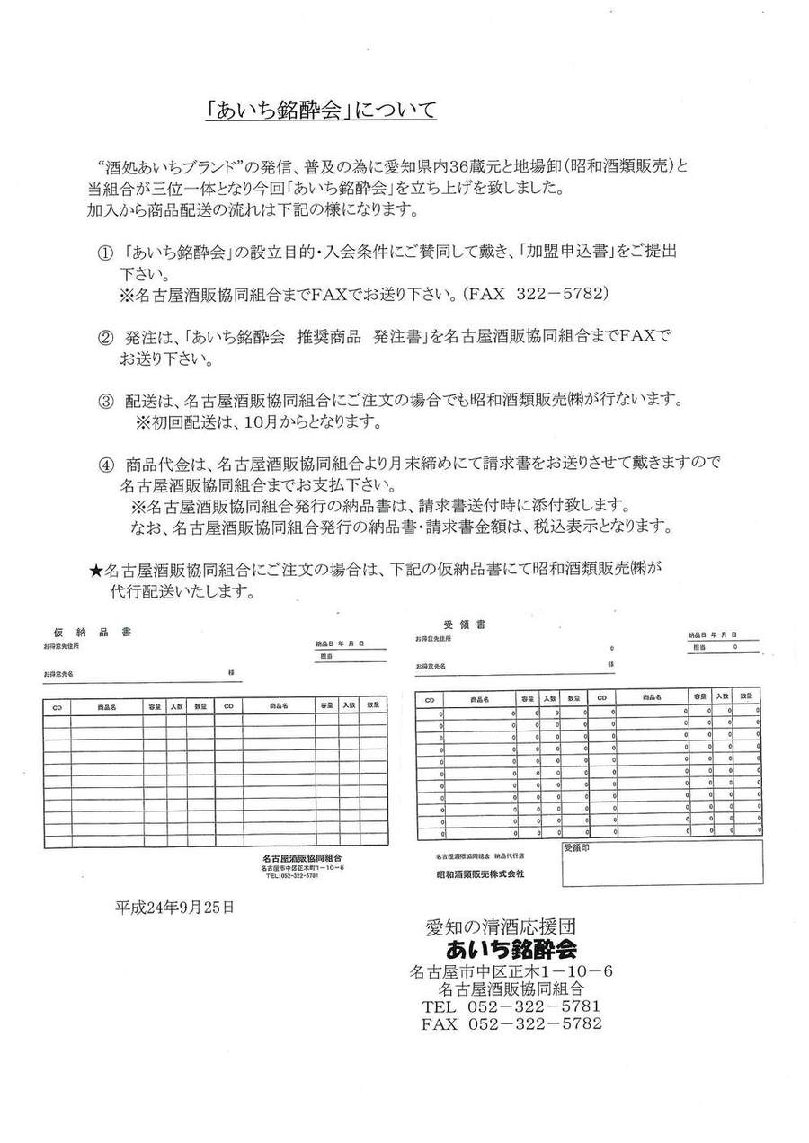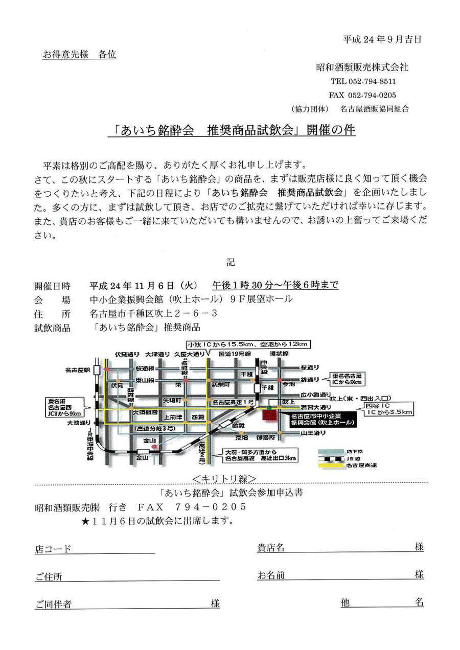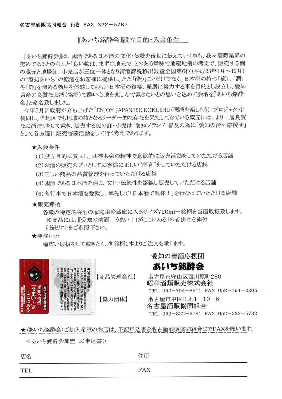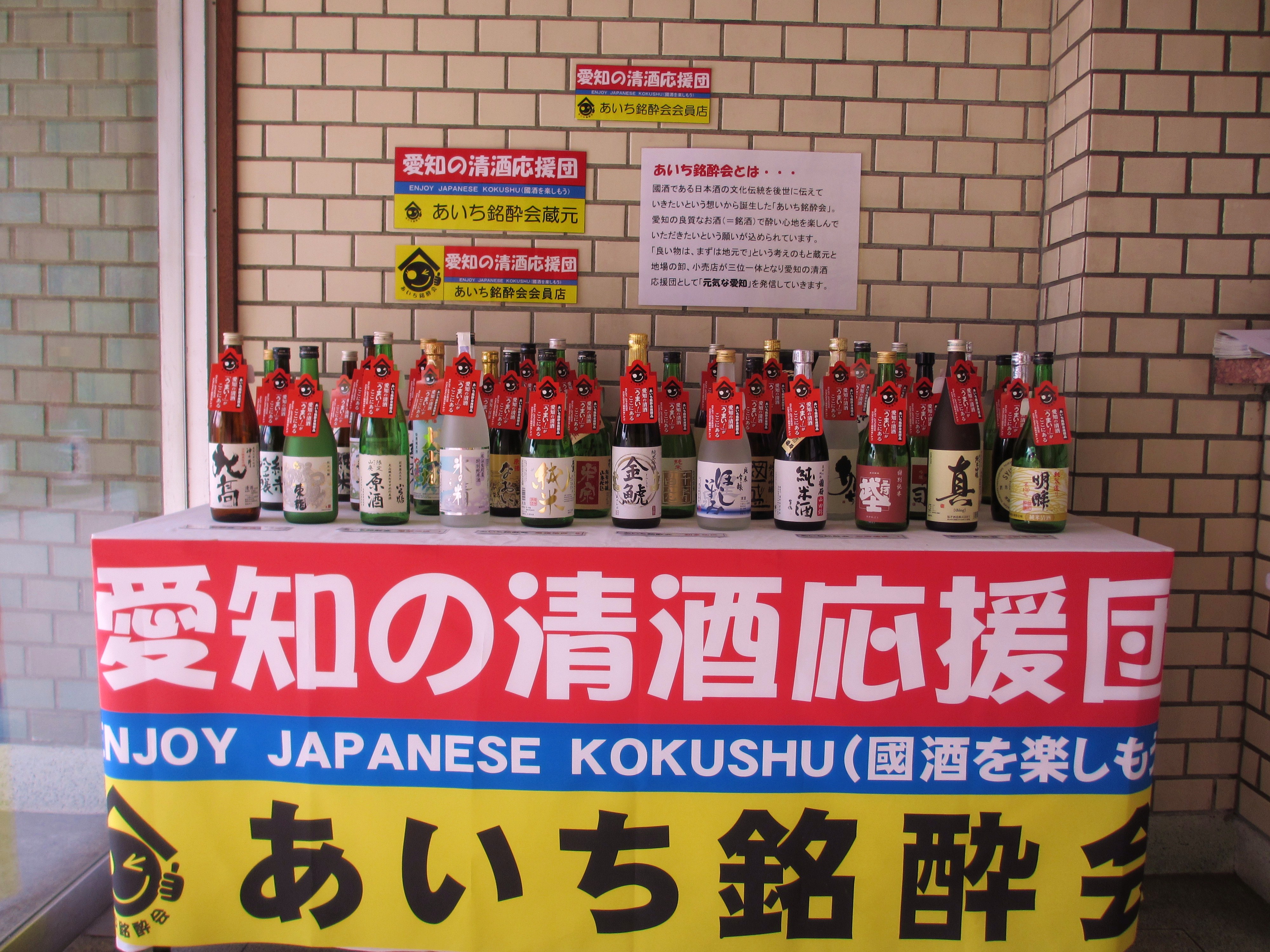 平成23年9月22日に愛地県庁にあ大村知事を表敬訪問し、愛知県産清酒の普及・発信を依頼し、それを機に愛知県産業労働部地域産業課より各種の提案を戴き、その一つとして愛知県産品アンテナショップ「ピピット!あいち」での試飲即売会を開催する運びとなり同年11月18日~20日の3日間に第一弾として「愛知の地酒フェアー」を開催し最終日の20日には大村知事と河村名古屋市長が訪店され県産酒をPRして戴きました。この場での消費者の嗜好は、やはり日本酒が本来持っている米の旨さを感じる酒質が好まれると実感し、蔵元、地場卸、小売店が力を合わせ地元愛知の清酒を普及しようと発足を考えました。地場卸は、昭和酒類販売会社と協同企画し商品管理会社として名古屋酒販協同組合へご注文された場合は、物量も行って貰います。