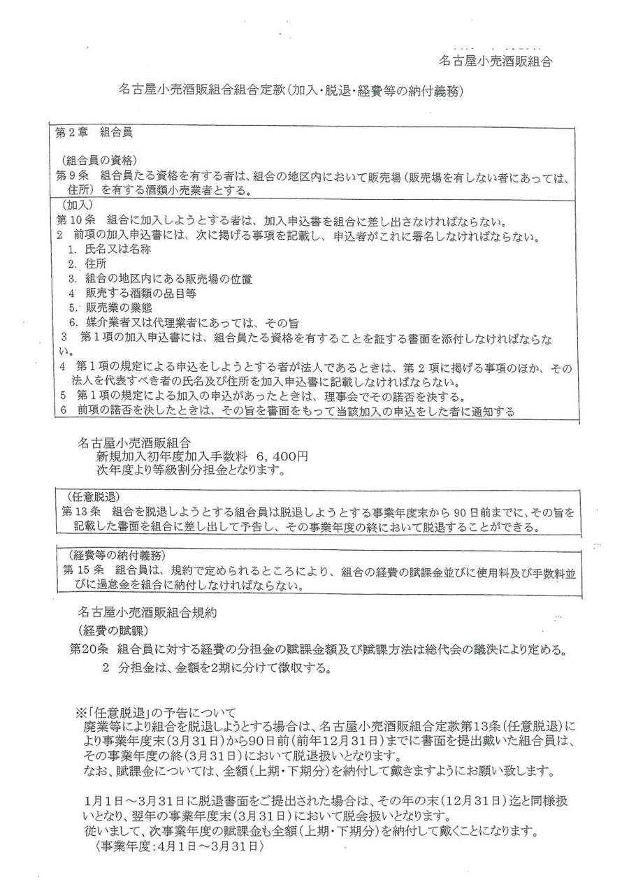廃業等により組合を脱退しようとする場合は、名古屋小売酒販組合定款第13条(任意脱退)により事業年度末(3月31日)から90日前(前年12月31日)までに書面を組合まで提出戴いた組合員は、その事業年度の終(3月31日)において脱退扱いとなります。
