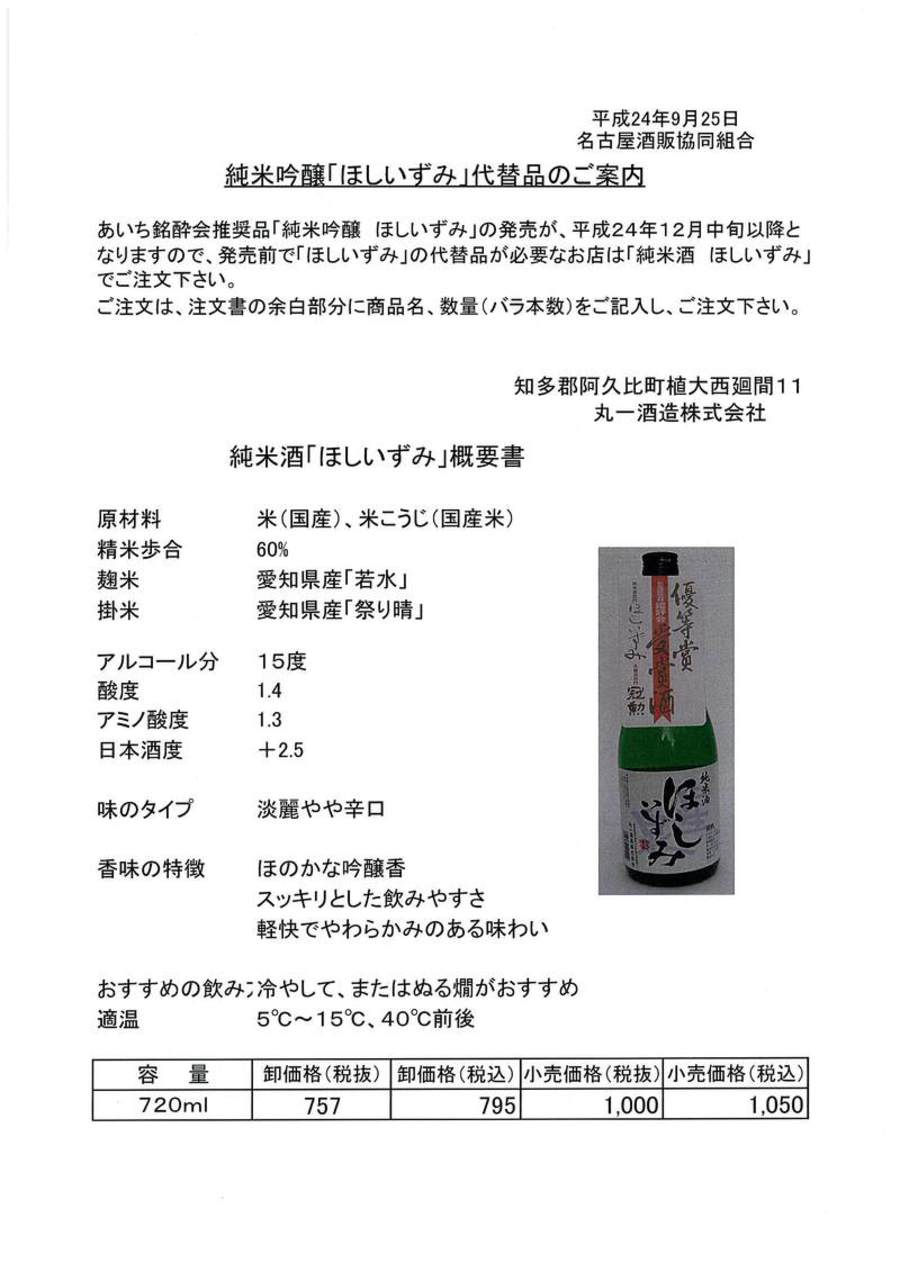(2)丸一酒造㈱の推奨品「NO.26 純米吟醸 ほしいずみ」の発売が平成24年12月中旬となりますので、その間の「ほしいずみ」が必要なお店は、代替品として「純米酒 ほしいずみ」でご注文下さい。