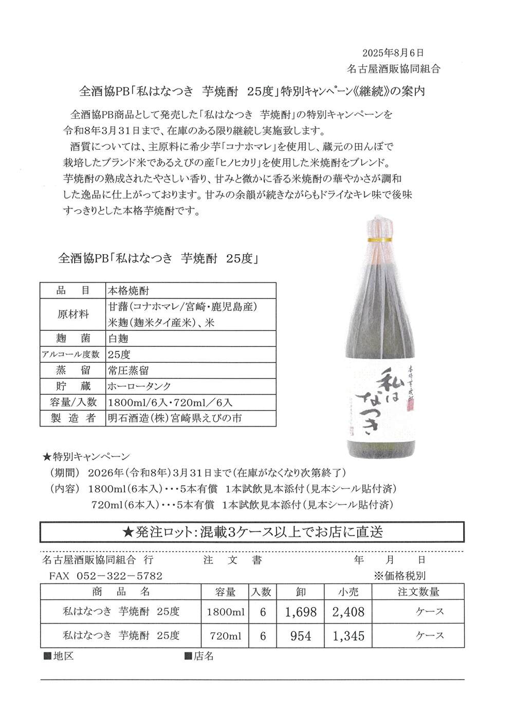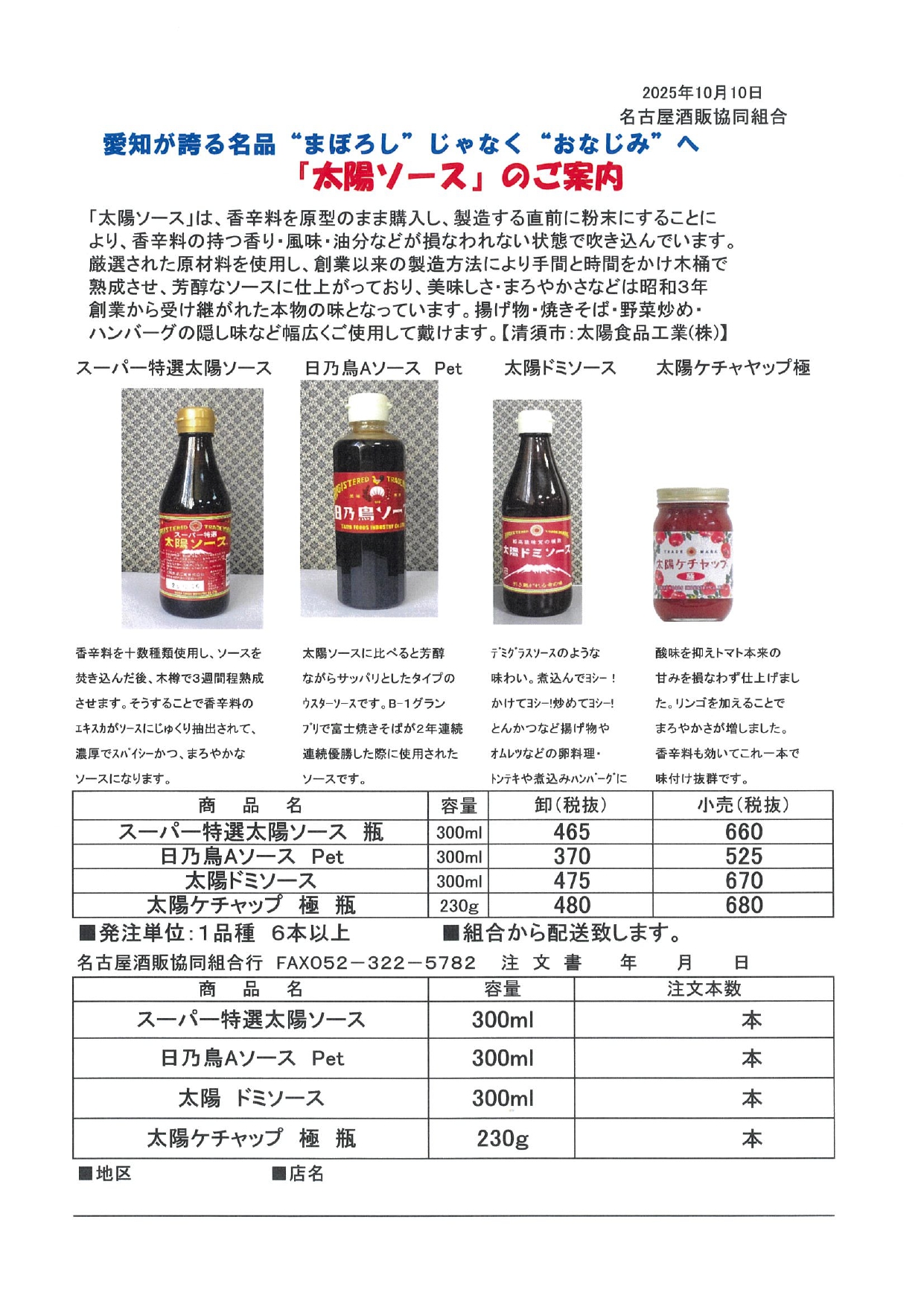 ご注文は、「太陽っソース」注文書をプリントアウトしてFAX(052-322-5782)していただくか、お電話(052-322-5781)でご注文下さい。