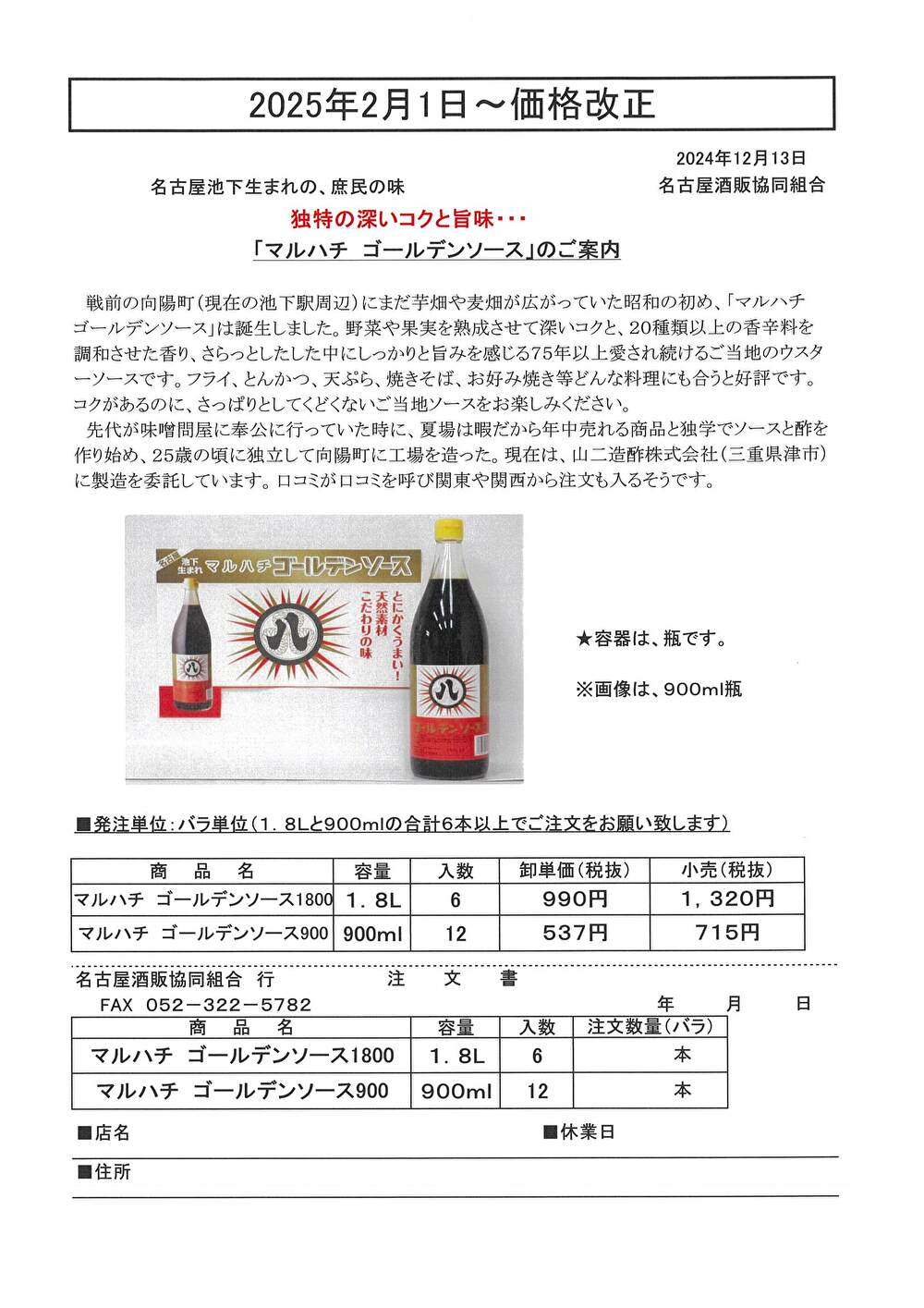 戦前の向陽町(現在の池下駅周辺)で、昭和の初めに誕生した「マルハチ ゴールデンソース」が2025年2月1日から価格改正となります。