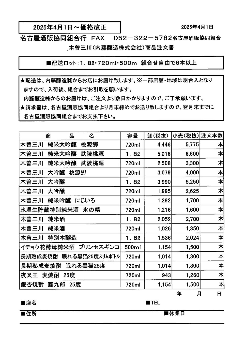 ご注文書は、木曽三川(内藤醸造株式会社)商品注文書をプリントアウトしてFAX(052-322-5782)していただくか、お電話(052-322-5781)でご注文下さい。