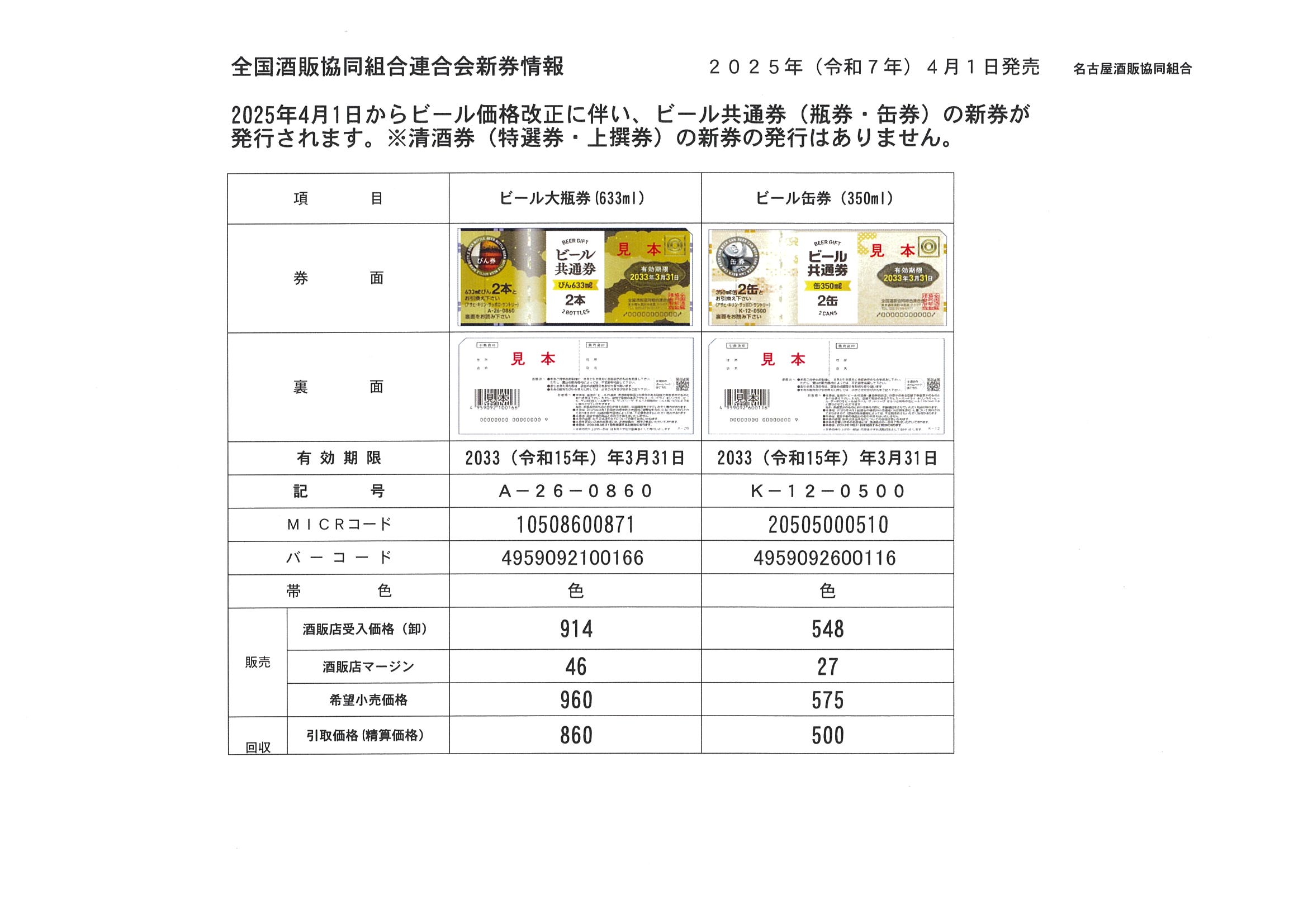 2025年4月1日からビール価格改正に伴い、ビール共通券(瓶券・缶券)の新券が発行されます。