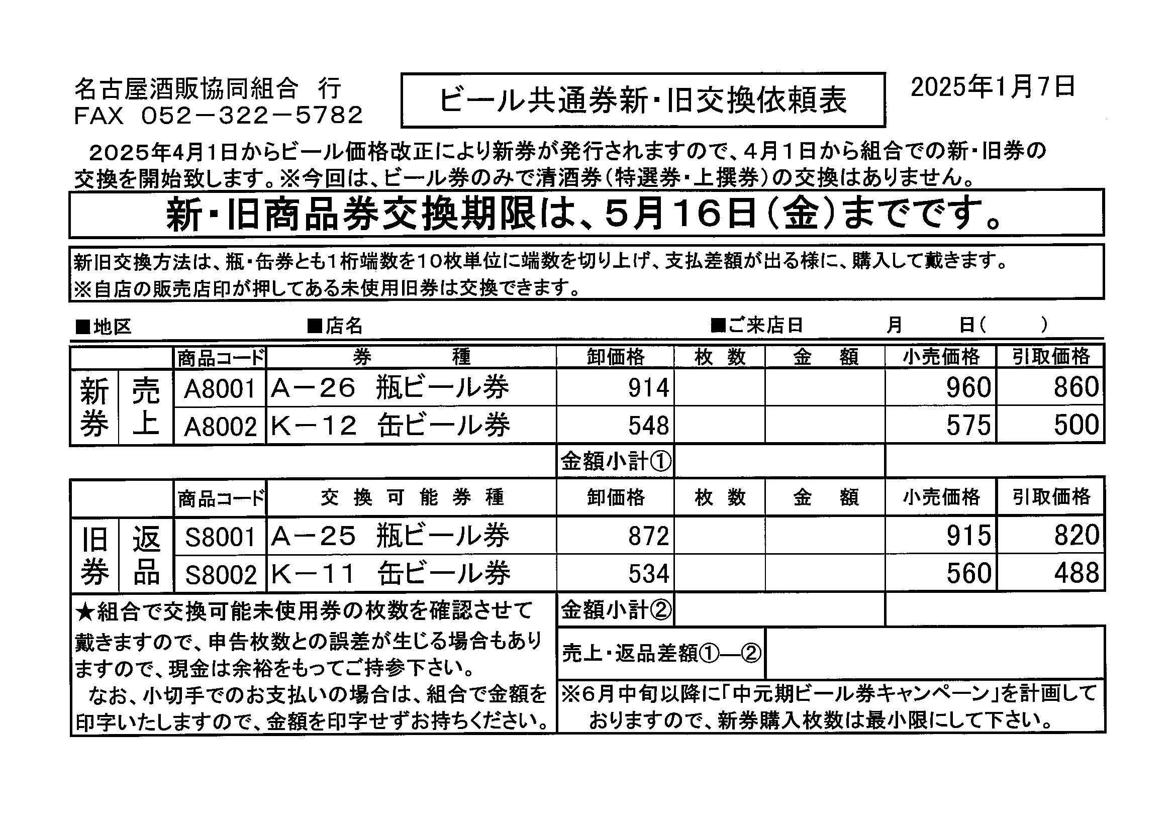 2025年4月1日からビール価格改正により新券が発行されますので、4月1日から組合での新・旧券の交換を開始します。交換については↓のビール共通券新・旧交換依頼表をお使い下さい。