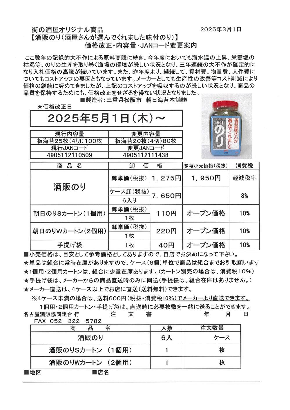 ご注文は、酒販のり注文書をプリントアウトしてFAX(052-322-5782)していただくかお電話(052-322-5781)でご注文下さい。