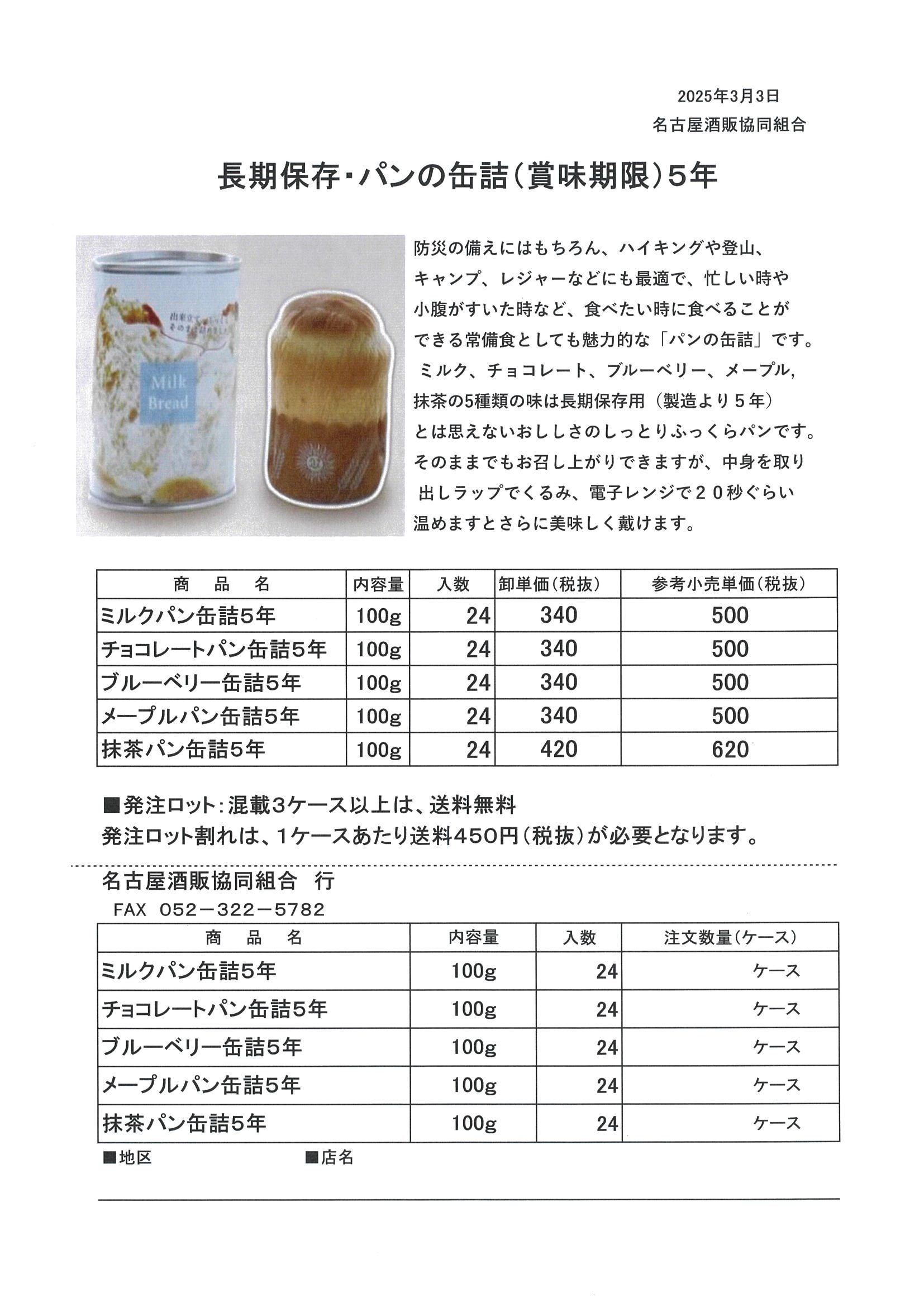 ご注文は長期保存・パンの缶詰(賞味期限5年)注文書をクリックしてプリントアウトしてFAX(052-322-5782)していただくかお電話(052-322-5781)でご注文下さい。