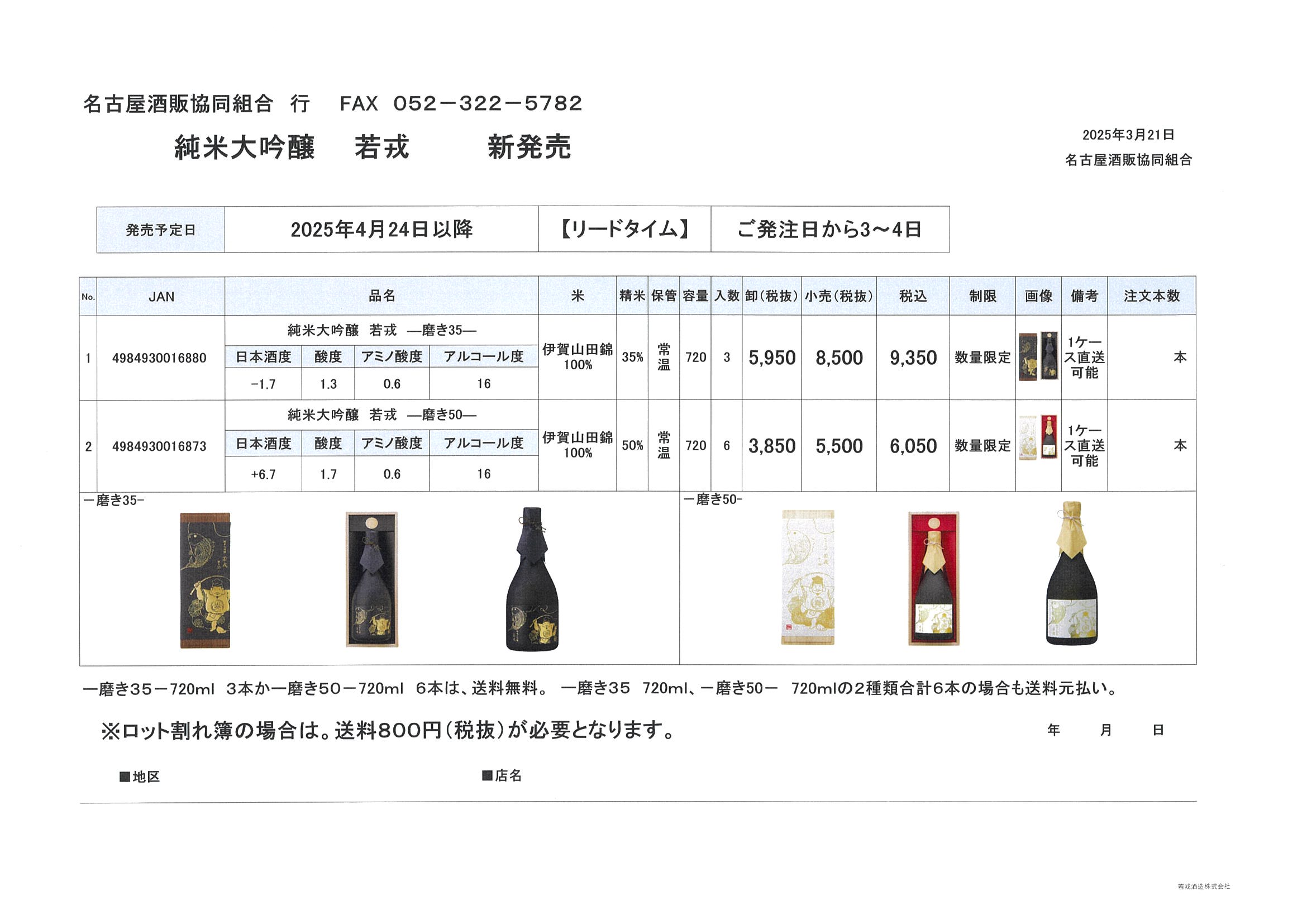 ご注文は純米大吟醸 若戎 注文書をプリントアウトしてFAX(052-322-5782)していただくかお電話(052-322-5781)でご注文下さい。
