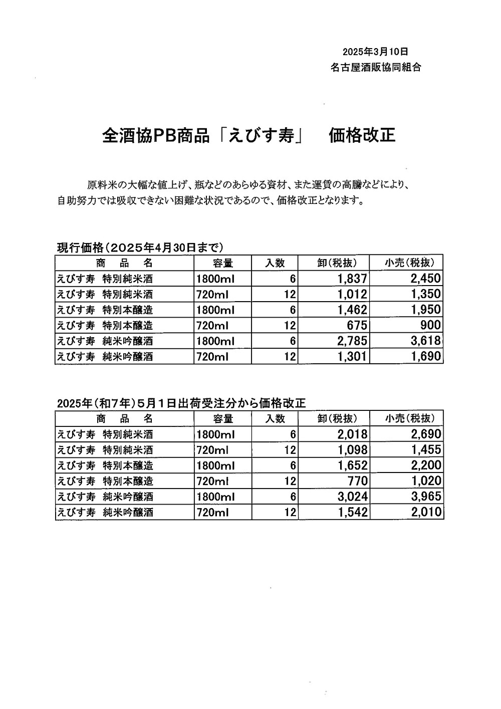 全酒協PB商品「えびす寿」が2025年5月1日より価格改正となります。