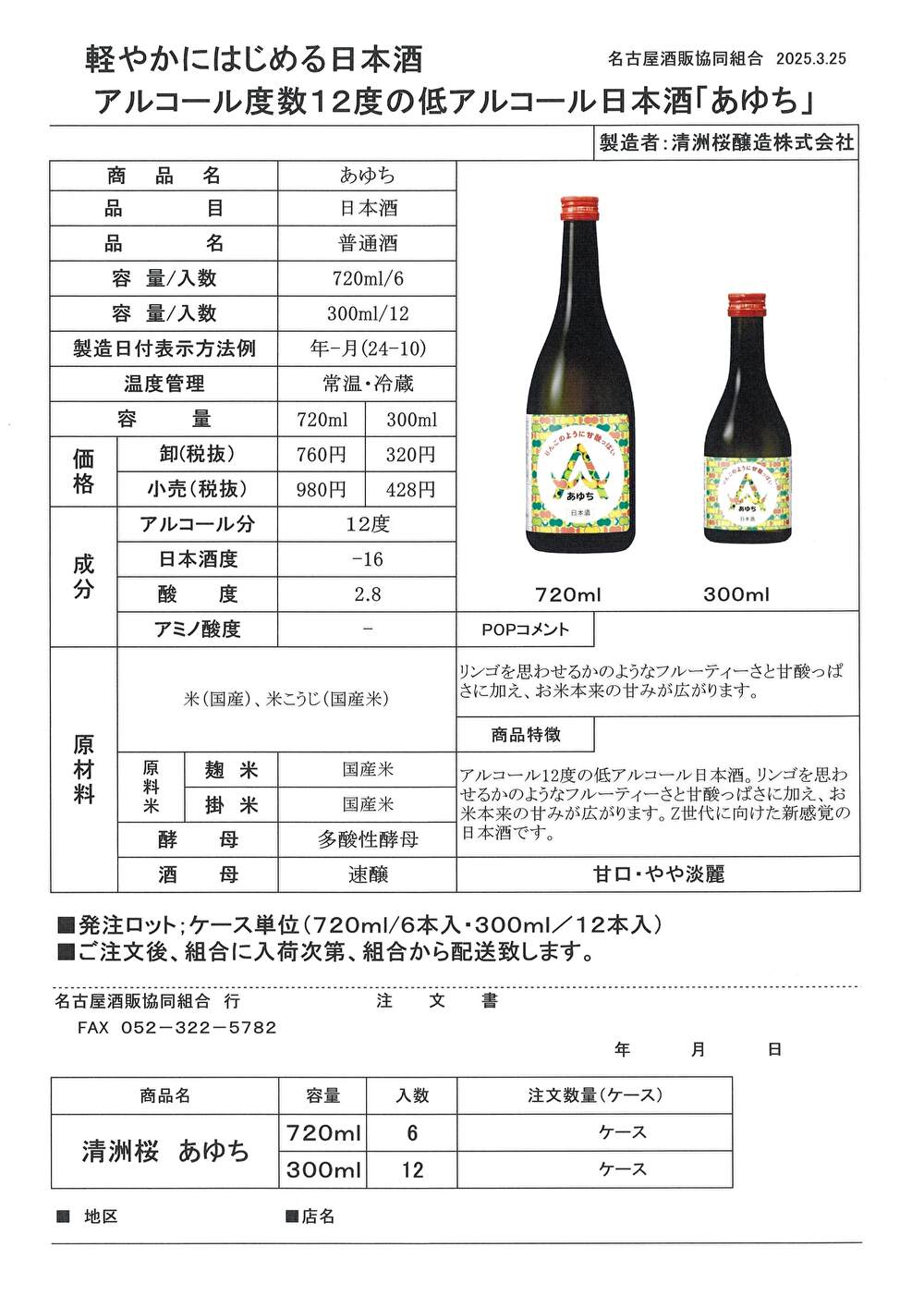ご注文は、清洲桜「あゆち」注文書をプリントアウトしてFAX(052-322-5782)していただくかお電話(052-322-5781)でご注文下さい。