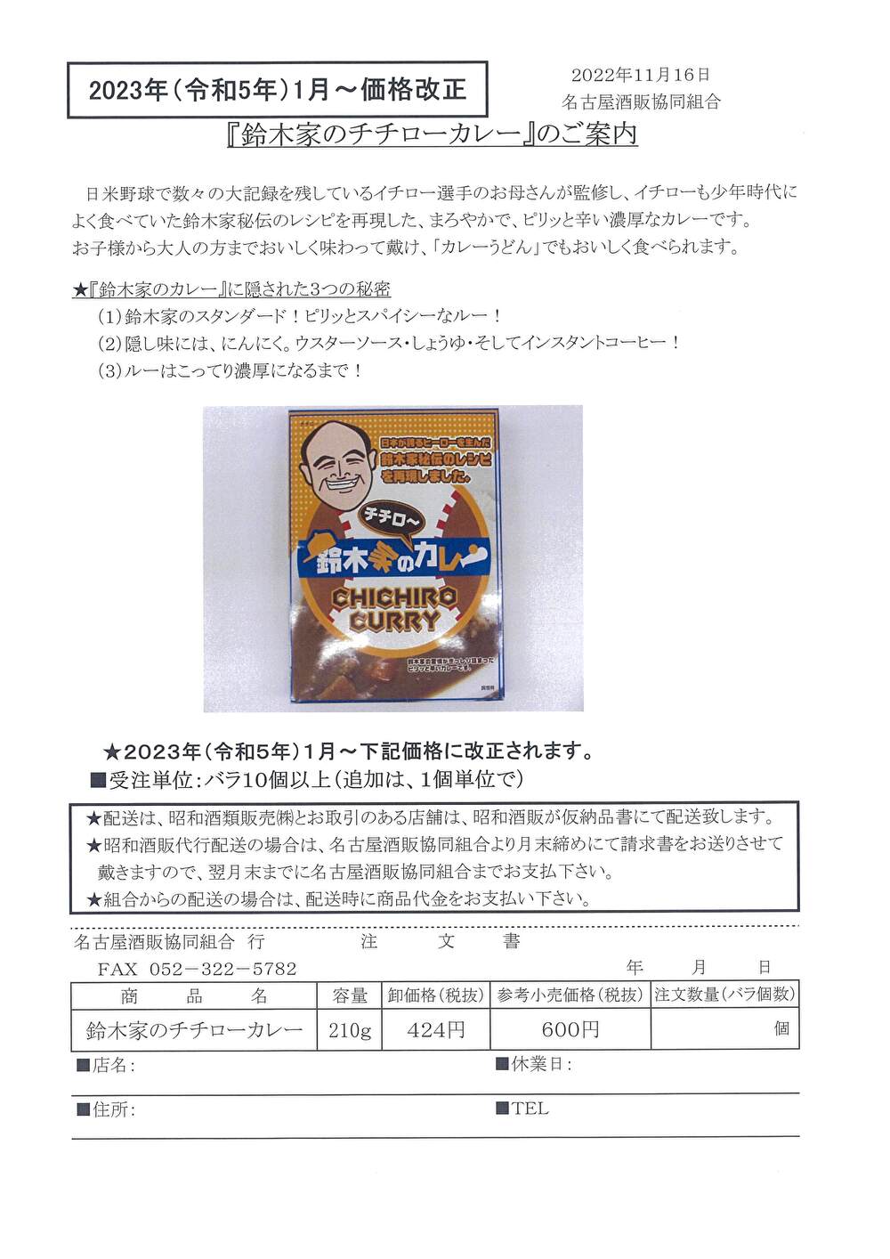 2023年(令和5年)1月~価格改正『鈴木家のチチローカレー』の案内