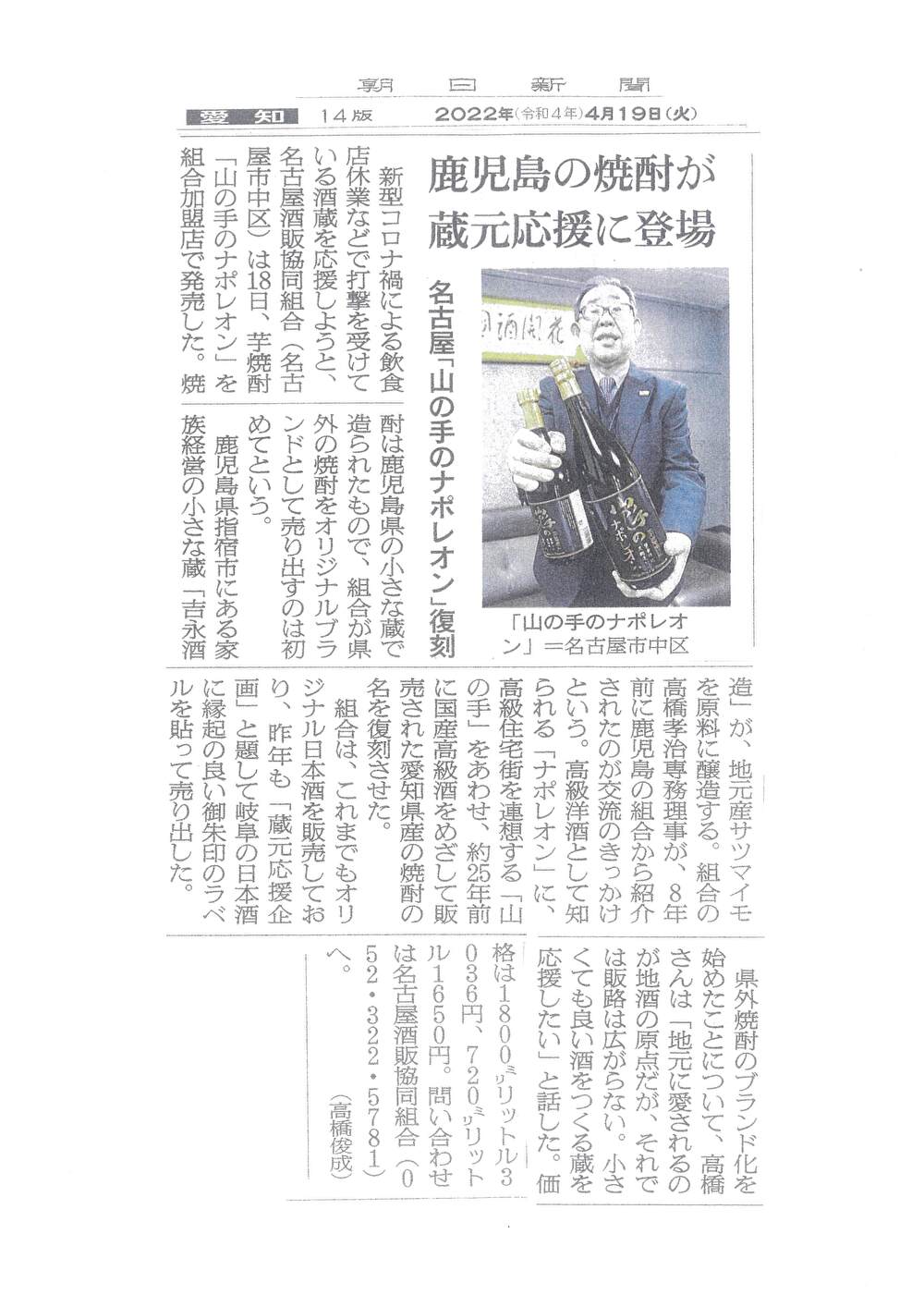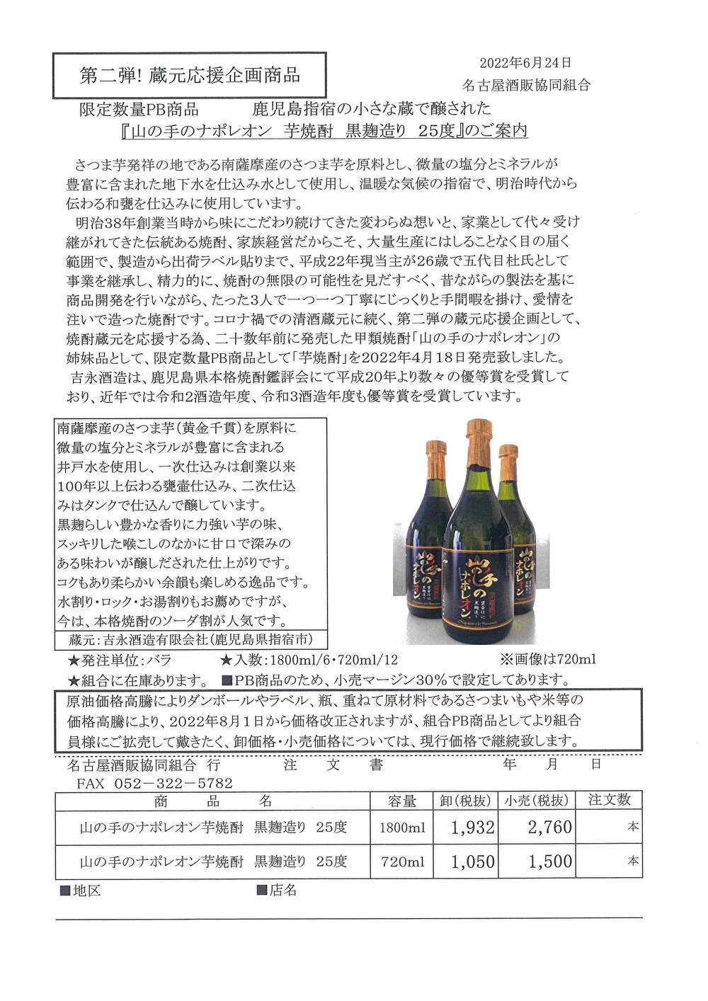 限定数量PB商品「山の手のナポレオン 芋焼酎 黒麹造り 25度」の案内 R4.6.23