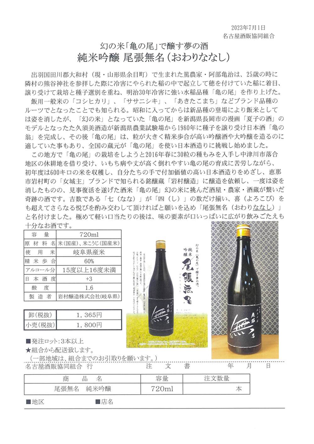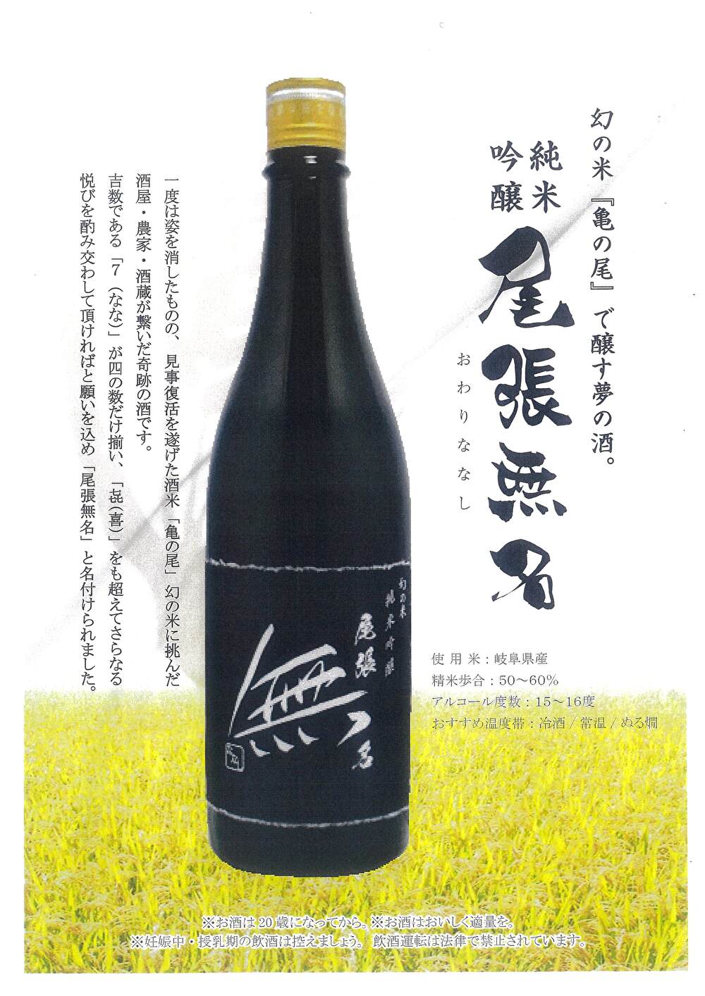 幻の米「亀の尾」で醸す夢の酒 純米吟醸「尾張無名(おわりななし)」の案内 R5.7.1