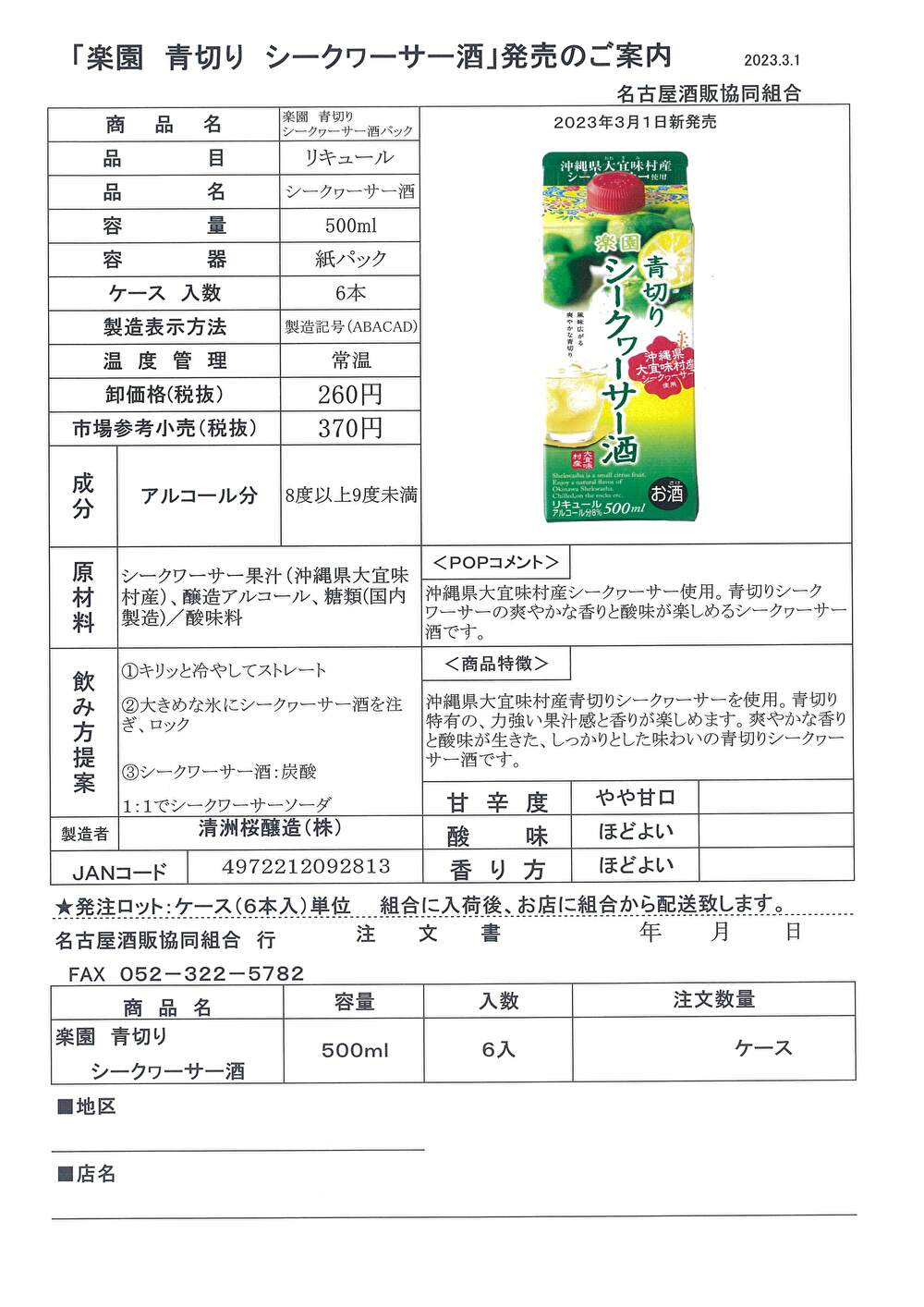 「楽園 青切り シークワーサー酒」発売の案内 R5.3.2