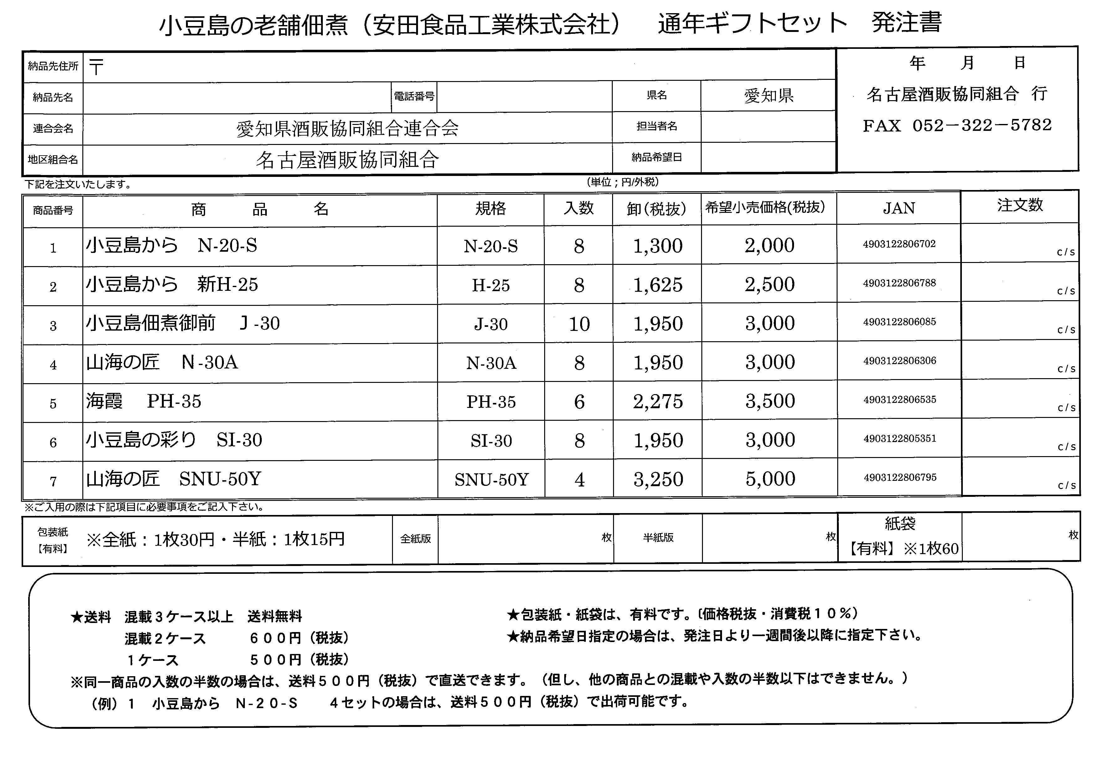 必要事項をご記入の上、名古屋酒販協同組合までFAX(052-322-5782)でご注文下さい。