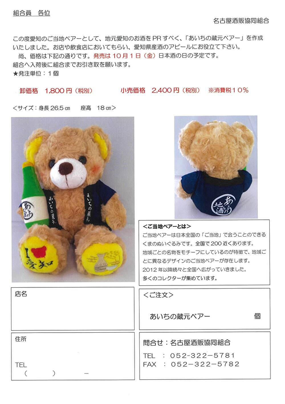 この度、愛知のご当地ベアーとして、地元愛知のお酒をPRすべく、「あいちの蔵元ベアー」を作成いたしました。詳細につきましては、↓の案内をクリックしてご確認下さい。