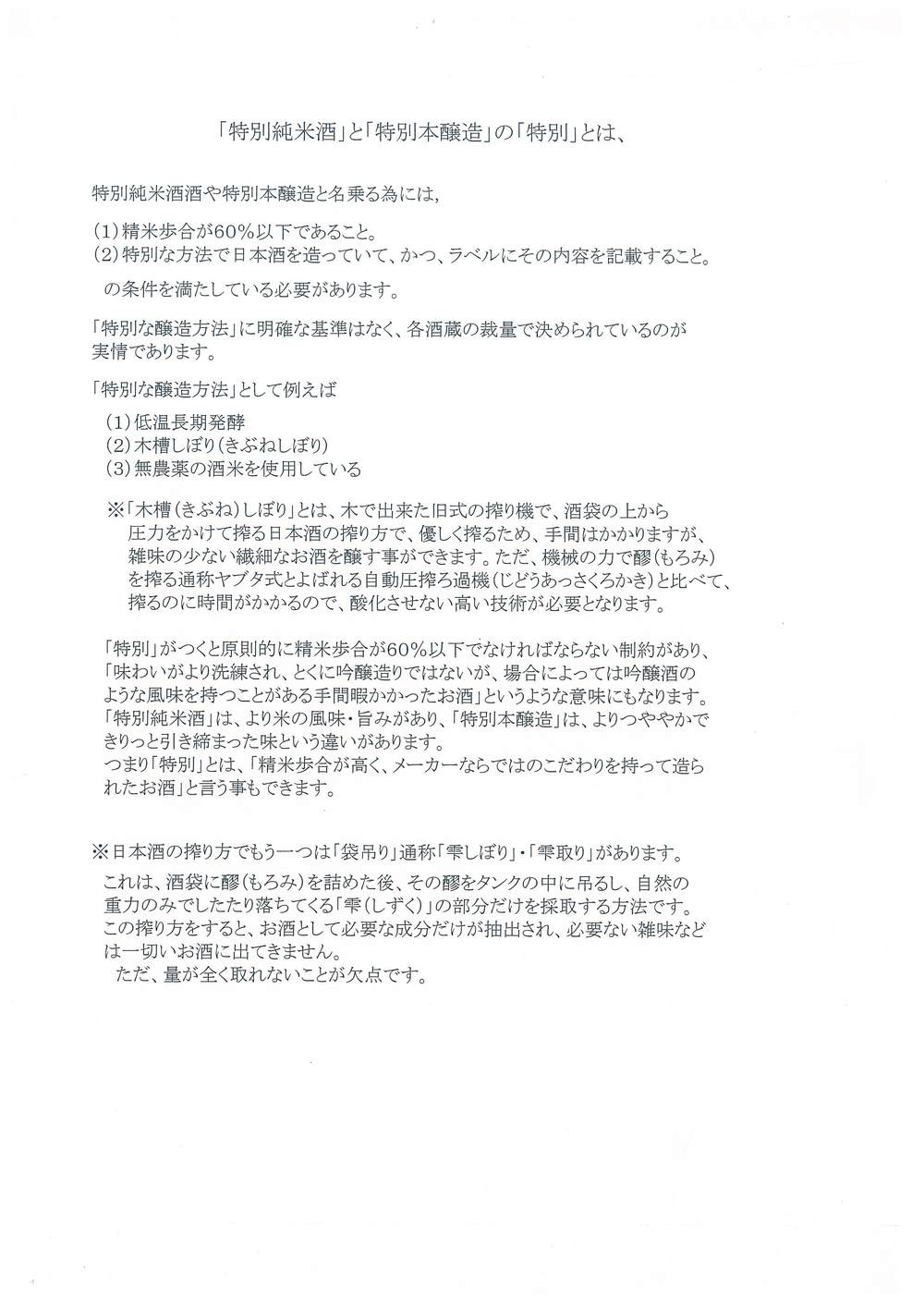 昨今、酒造メーカーから発売をされる清酒に「特別」と表記されるお酒が発売されていますが、この「特別」の表記にはいくつかの決まり、条件があります。詳しくは下記に記載されていますのでご参照願います。