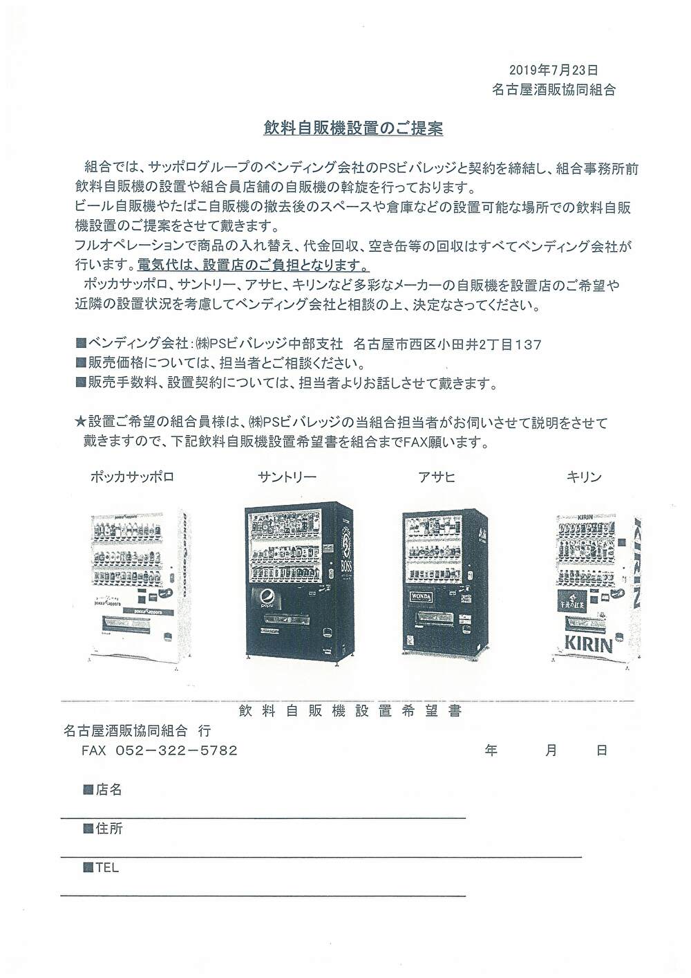 設置希望の組合員様は飲料自販機設置希望書をプリントアウトして組合までFAX(052-322-5782)して下さい。